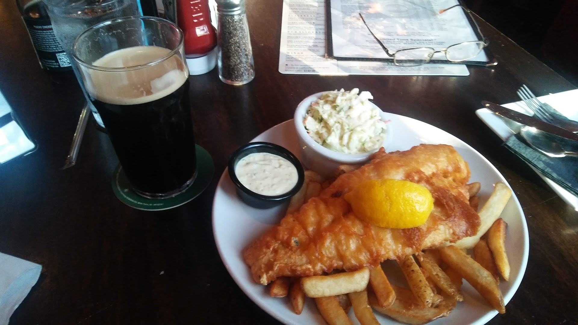 For my first time at the restaurant, however, I had to try their iconic headline entree, the Fish and Chips. The Pub prides itself on this dish, and for good reason - it's excellent! A large filet of haddock, lightly breaded and fried, with a very generous pile of chips and ramekin of delicious slaw, and I shouldn't forget the homemade tartar to go with. Paired with a Young's Double Chocolate sweet stout, it'd be hard to ask for a better meal!