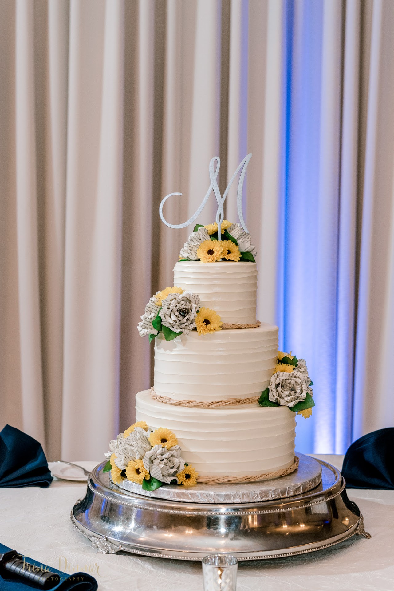 On our big day, the cake looked so lovely! They absolutely nailed our overall vision! They were also so willing to add in the book page flowers that a friend made for us. The only bummer was that we had requested to have a little Deadpool peeking out from under the cake, and that bit...