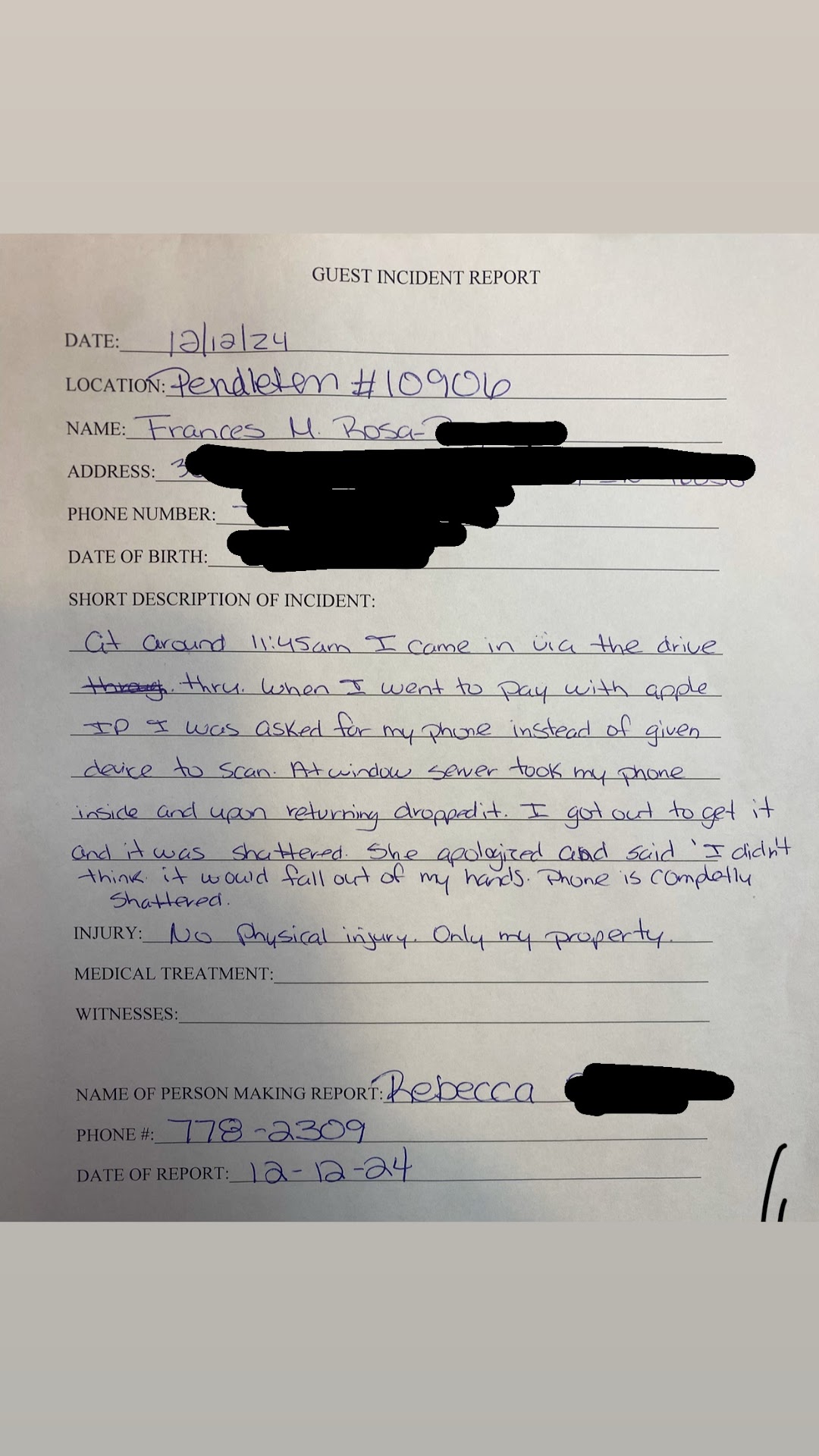 Since apparently we live in a time where unless you go public with someone you just get ignored. Im a teacher at Pendleton Elementary and on December 12th went to the Wendys drive thru for a quick lunch before dropping off my son at his pm preschool. I had gone to Falls Perk drive thru first and paid with tap on my phone since I left my card at school, she got the machine out and I tapped from my window. I went to do the same in Wendys when I got to the window I was asked to hand her my phone. I asked her to give me the machine and she asked if I could just give her my phone. I did and when she went to return it so I could face ID she dropped my phone. I have a pick up truck btw. She immediately apologized and stated she was sorry for dropping my phone. As you can see in pictures phone was destroyed. I filled out a claim and got a call later that day from the district manager Casey. Solution they offered was to fix my screen. That was not an option since it was also bent and could stop working at any time. Fast forward and multiple calls back and forth she stated the director of operations would send this to their insurance and get back with me with a better solution. I was patient, I knew the holidays were coming but when I reached out after Christmas there was NO confirmation the claim was actually filled. So I called Wendys corporate who then contacted Casey. That upset her and after our text messages that day she has stopped answering my messages. I have now spoken 3 different times to corporate and no response. That is why now I am here to see if the owner of the franchise or someone can help me. I am an honest person. Everyone at the school knows me. All I wanted was food and not my phone to be destroyed. So let’s see who...