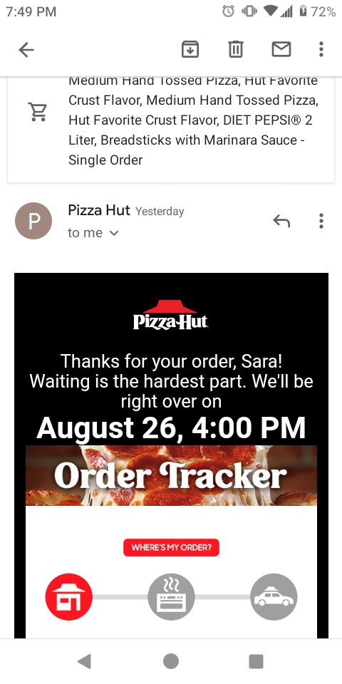 I had placed an order to be delivered on August 26th at 4:00 pm the night before, because I knew I was going to have a busy day at work the next day. I received a confirmation email, and never had any indication that anything was wrong with the order. At 3:45 when I checked the order through the "track order" link attached to the confirmation email it stated that my order was being worked on. However, at 4:30 when the order had not been delivered yet my husband called the store to find out what was going on. He spoke to a gentleman whom he was told was the manager, and was instructed to come in with the confirmation email. When he did he was informed that the person he had spoken to was actually a delivery driver, NOT the manager. He was also told that the store had turned off their online ordering the night before, and that despite the fact that I had received a confirmation email that they had never received my order. So I had to come home after working all day to a hangry husband and children. If a store turns off their online ordering then a confirmation email should NOT be sent. There should be some sort of indication that the store is not receiving orders at that time. There are no words to describe how upset I am over this. I will NOT be...