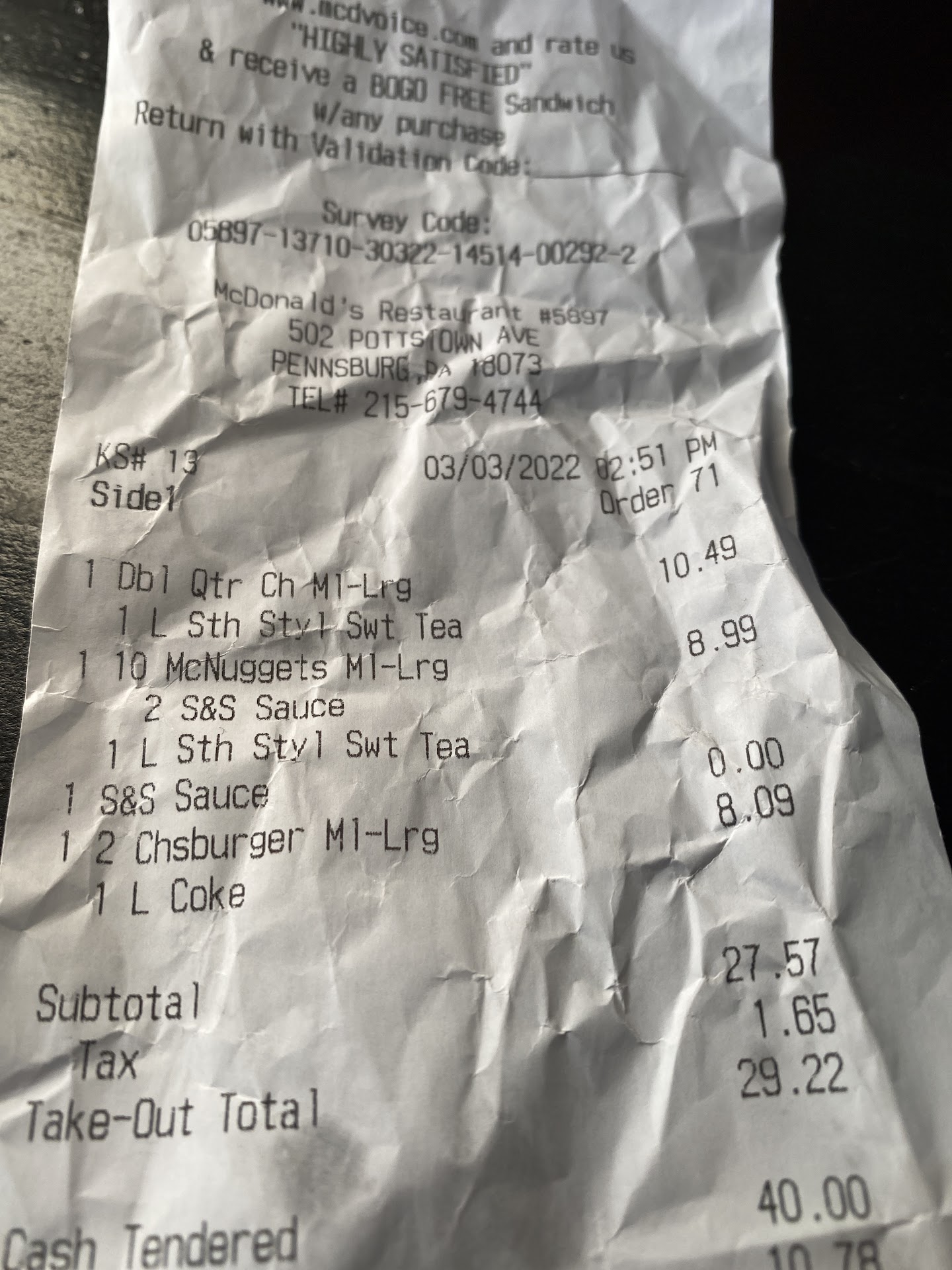 Read moreI have to say this might just be one of my top three worst McDonald's experiences in my 48 year lifetime. I visited yesterday either my son (order #270). We ordered around 6pm. They gave us one of those table tents to locate us when our food was ready. Well 615pm comes around and no food. I'm trying to be patient I know many places are short staffed. 620pm no food. I decide to go check on things at the counter. I stood there for at least a few minutes and was not acknowledged. From where I was standing I could see my tray with my order clearly ready and staged to be brought out. The counter girl was fiddling with some machine and my order just continued to stay there. Getting cold. I went back to my table (sorta gave up at that point) and I hear my order number called out and my tray thrown on the counter. Why was I given a table flag? I saw them bringing food to other patrons. What happened? Well all our food was cold. Especially the fries. I took all three orders of fries up and asked for a fresh batch. That took another solid 10 minutes. Between all these shenanigans and actually taking time to sit and eat it took us over an hour to get out of there. Fast food? LOL. Service? Even worse. ...