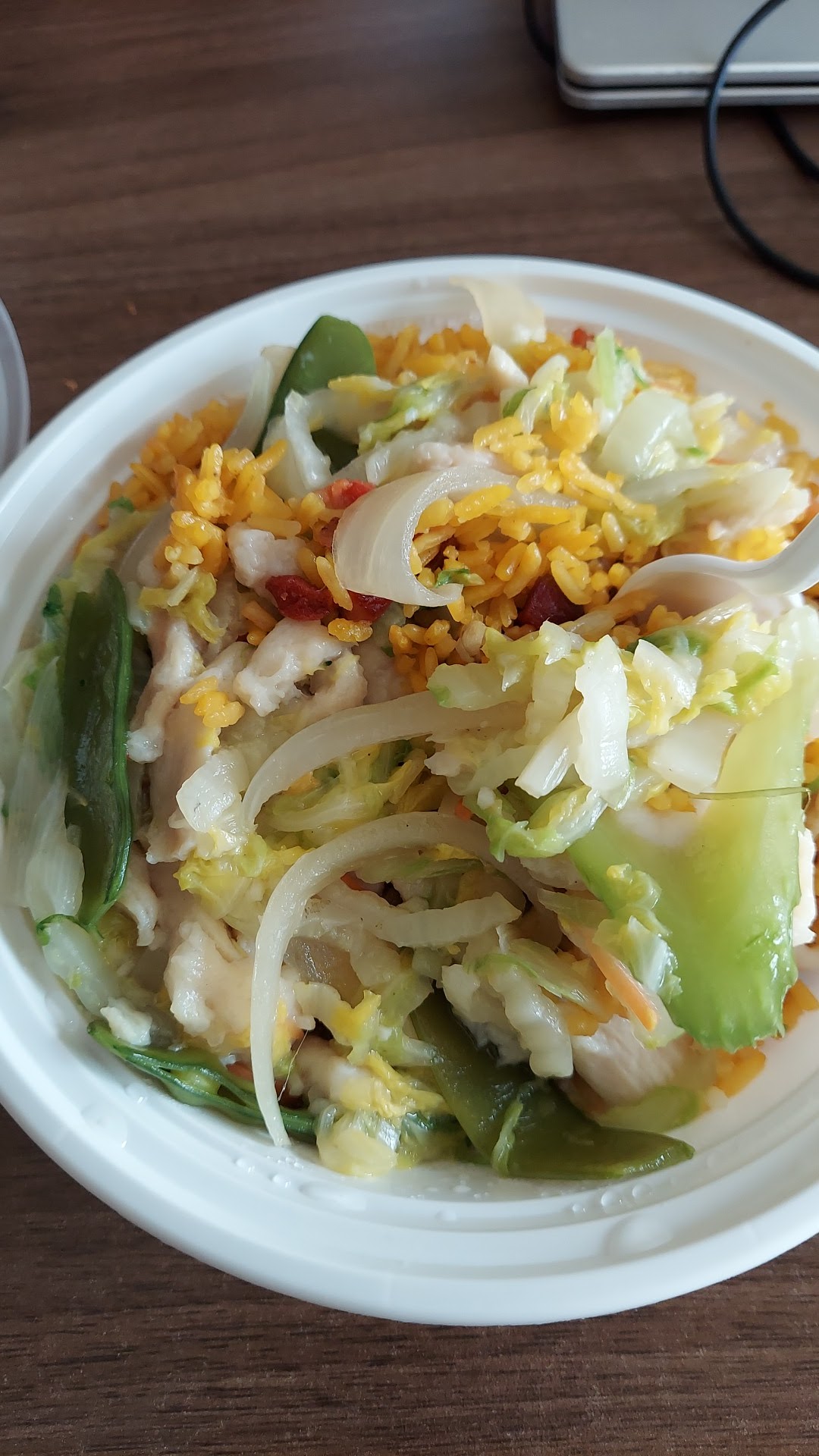 The chicken chow mein turned out to be chicken with mysterious yellow color rice . The rice smells oily and tastes like wood. See the first picture.