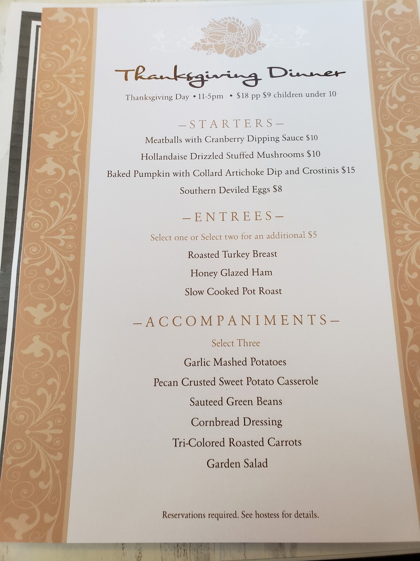 We had a Thanksgiving Day dinner here today. I had an 11 am reservation. The first reservation of the day. Keep track of the times in my review as they are important. Also the meal was $18 per person for Adults.