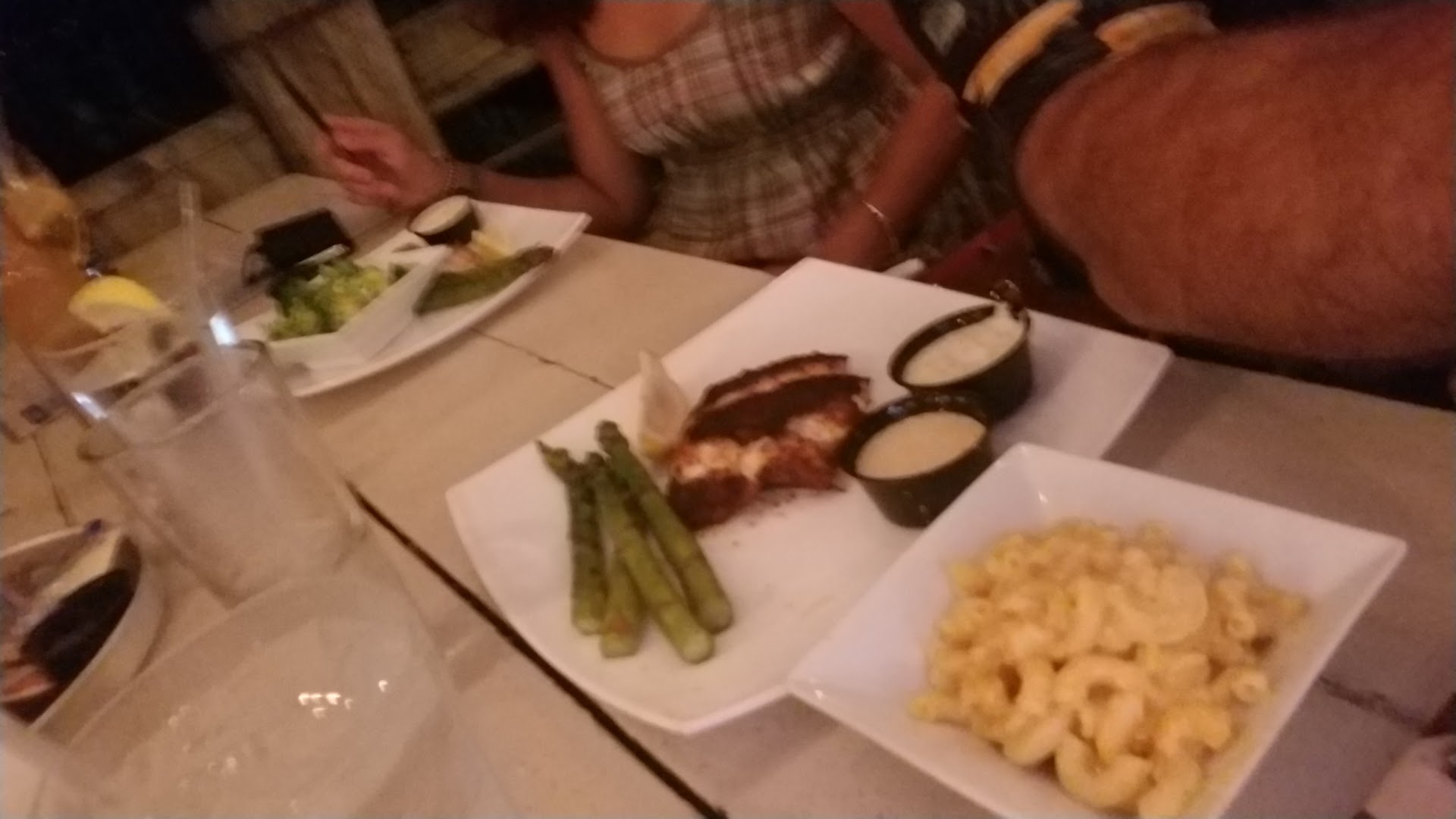 Read moreWent here in a whim because the wait was slightly long at the fish house. Ate outside with the water in the background. Nice lit area with tiny light bulbs stringed up. The side of the 2 restaurants seem a little more upscale without having an upscale attire requirement. We were seated and greeted immediately. The food was superb. At first I didn't really see anything worth getting besides the grits a ya ya but the hubby and I both decided to get the evening specials. I got the crab stuffed red snapper and opted to change my sides to the collard greens and gouda cheese grits. The hubby got the steak with a potato cake stuffed with artichoke, feta cheese and something else I can't recall and covered with a sauce, served with a ear if sweet corn on the cob and grits. The little one got the chicken fingers and grits. The food was brought out in short time. Everything was presented and tasted delicious. My entree was covered in a sauce that made the dish taste amazing. We all received huge servings of the grits which were very good, it had pieces of corn in it too. My collard greens were cooked the way I liked them, not too vinegary tasting. I ate half of the hubby corn on the cob and it was delicious, very flavorful Mashup of sweet and buttery with a lightly grilled taste. Overall i was extremely impressed and pleased with our meal. Large serving size and the food was nice and hot. Would definitely return...
