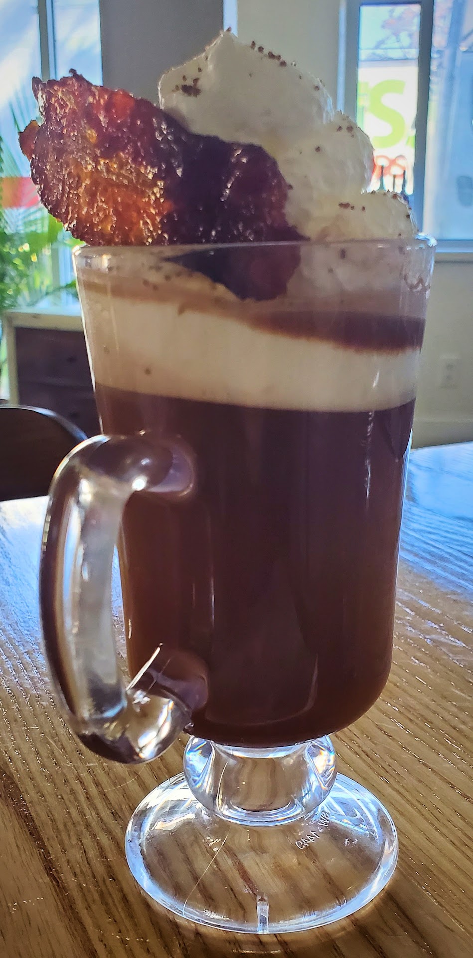 Now, I would be doing you a disservice if I didn't tell you about their Irish Coffees - I got cinnamon and my mom got hazelnut, beautifully topped by Katie's whipped cream and sprinkled with cinnamon and nutmeg. The drinks came out the perfect temperature for an October morning and were dangerously smooth. Katie insisted we also try her homemade hot chocolate - a mix of cocoa, spiced rum, and topped with candied bacon! Generally I avoid bacon and chocolate together, but this was a show-stopping combination that ended up being my favorite drink of the morning!
