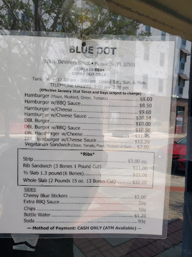 So what is Blue Dot? It's a old school, hole in the wall burger joint that does things their way and only their way. They've got burgers done one way and on some days they have ribs. They are cash only. Often there is a line and a wait. The man comes out and takes your burger order. When he gets everyone he goes in the back to help put them together. He comes out with your burgers and asks if you want chips or a soda and takes your money. It's his place and he does it the same way he has for 30 years and I respect the hell out of that.