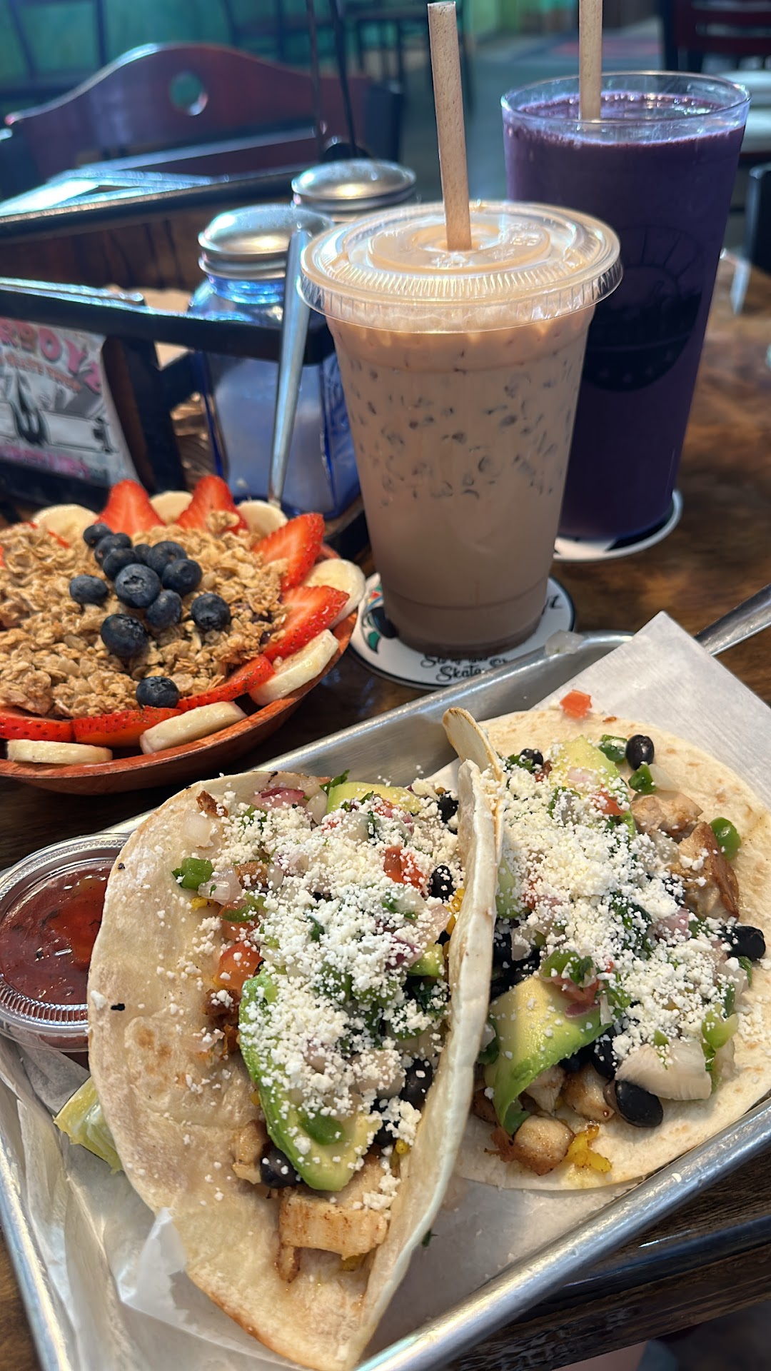 Atmosphere: Located in the Waterboyz Surf & Skateshop, the cafe is located on the left-hand side of the space and has a cozy nook feel to it! The whole place is of course themed surfing and skateboarding with decorative pieces all on the walls in the space. A lot of the time they have live music being played by local artists! Service: You order at the counter, and then they bring the food out to you! The ordering process is smooth with menus set up at the front when you first walk in. Menu items: Iāve been getting their Sunzal Tacos for years! Theyāre so flavorful and pair well with an acai bowl. I get their Ala Moana bowl (blueberries, strawberries, banana, and granola) as well as their Shorebreak smoothie (almond milk, blueberries, strawberries, and banana). Their Dirty Chai Latte is one of the best Iāve had in Pensacola; it can be hard to make it taste just right, and they do such a great job with it! The food and drinks never disappoint!