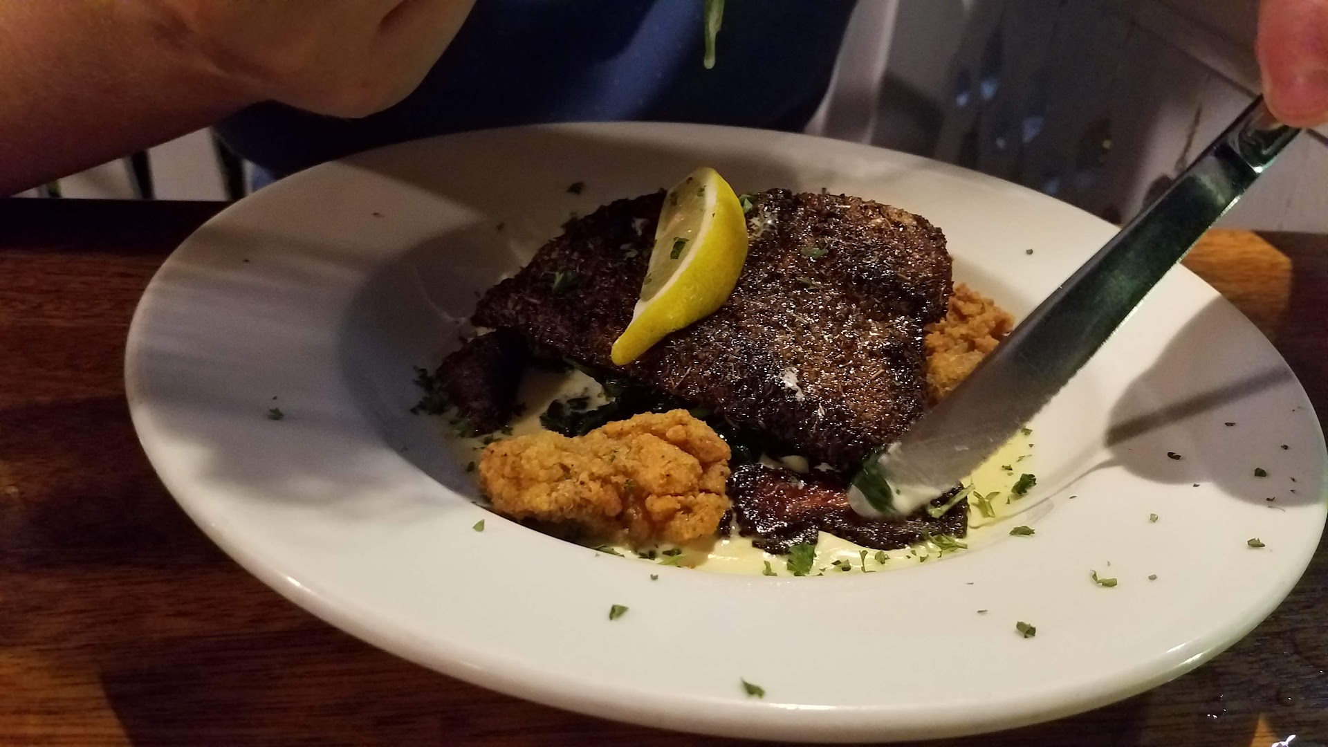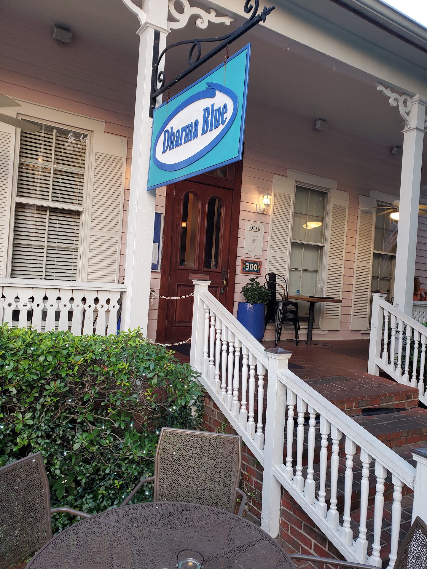 Read moreOur first time dining at Dharma Blue. When I called, I was told reservations weren't necessary but a good idea. I agree, the place fills up quick. We had 7:30 reservations (made the same day) and it was very busy when we arrived. We chose to sit outside, because it was a gorgeous night. Our waitress was very pleasant, very knowledgeable and very helpful. We ordered fried green tomatoes (delicious) and dharma chips (I thought a little salty, but my family enjoyed them) for appetizers. My oldest daughter ordered sushi and my youngest the chicken tenders. They both enjoyed their food....said it was delicious. My husband and I ordered the ribeye. Both were cooked as ordered (med well and med). I had what I can only call a religious experience. It is, by far, the best steak I have ever eaten. So tender and juicy, the meat melted in my mouth. The flavor was spot on. The asparagus was cooked perfectly and the mashed potatoes very delicious. The cream brulee was a wonderful ending to the meal. We had 2 apps, 4 meals and 1 dessert for $113. The restaurant is family friendly, but also cozy for a date night. It sits by a wonderful park that we took a walk in after dinner. We spent about 2 hours here for dinner, but it was well worth the wait. Definitely a return visit...