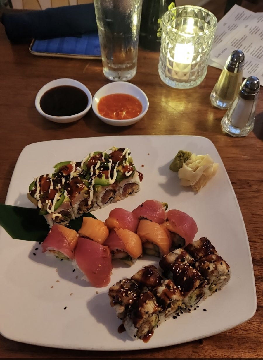 Dragon Roll: delicious. I could taste everything and all the flavors melted on my tongue. 8/10 Big Papi: Dharma Blue's best seller, it really was all it was talked up to be. So far it's the best sushi I've ever had. It had a combination of vastly different flavors that all somehow tasted like it was supposed to be together. 10/10 Tiger Roll: Not bad. I definitely tasted the fresh raw fish, and me not being a big fish fan, it tasted amazingly fresh without it being fishy. 6/10 Spicy Octopus: Wasn't spicy. Great, Amazingly fresh taste. 6/10 Creme Brulee: Amazing, great flavor, the fruits went well with it, I wish it was more. 9/10