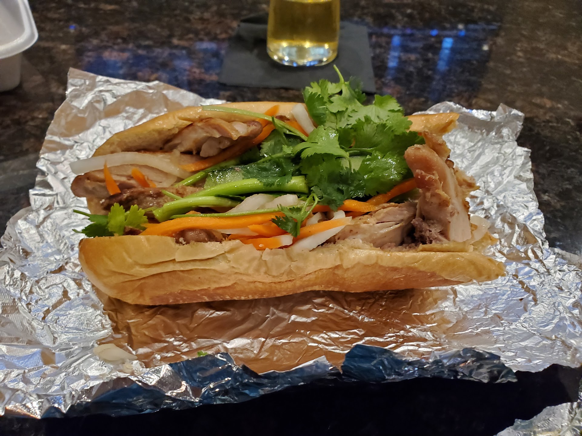 I ordered the Banh Mi with chicken and it was outstanding! Full of fresh, vibrant veggies and that same juicy chicken. It's a big sandwich so go hungry or plan on having leftovers! Picture posted is after a couple of bites were taken out and you can see how big and full this sandwich is.