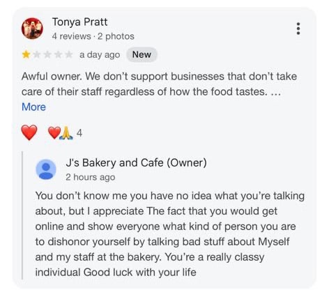 Ā Ā Ā Read moreNew management SUCKS! As a longtime J's cake conasuer, I was skeptical about ordering my daughters 1st birthday cake from there since they recently underwent new management. Against my better judgment I thought I'd give it a try anyway, hoping to get the same delicious cake I grew up on. The cake was beautiful, but very deceiving because it was raw on the inside! Once I cut into the cake, it was dry, yet the center of it was like dough. I called to the bakery to inform them of the undone cake and was basically called a liar by the owner Erica and cake decorator Shanelle. I was told there was no way the cake was raw. And to think, this is only the second issue that made me regret my decision. The first was when I ordered the cake on a Monday before the party, well in advance and was asked when I needed it ready by. I informed the baker I wanted the cake ready at noon that Saturday. She messages me the day of the party asking again what time I need the cake, that the time was "smudged" on the receipt. š I again told her 12. We show up at 12 to get the cake and it's no where near ready!! We had to wait an hour to get the cake! Which of course made us late for our baby's first party. You would think the owner would be sympathetic and accommodating after they dropped the ball so many times....nope! Wasn't offered an apology, but was insulted and made out to be a liar. They did offer a measly 10% off, but when u spend $100 for a cake for a special ocassion u kinda want it to be perfect. That's not enough to make up for ruining her cake and causing us to be late or the sucky customer service we received. NEVER will I ever spend my money at J's bakery again and will discourage everyone I know from doing so.