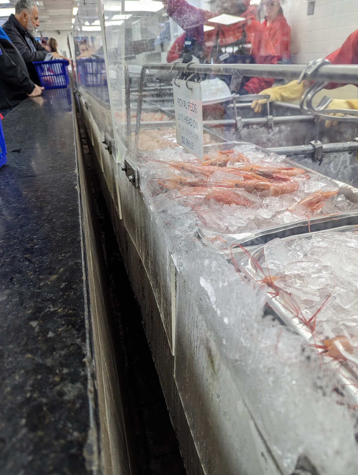 After you choose your fish and shrimp, you'll take your basket to the checkout where you'll choose if you want it steamed. Mild has only the tinniest of flavor spice. You'll pay for everything and they'll pack the rest of your fish in ice and give you a buzzer to wait for your shrimp. We were rookies last year and it wasn't busy, so they didn't give us a buzzer. We thought the shrimp was in the bag, so we walked out. Than goodness a worker came out to the parking lot running after us.