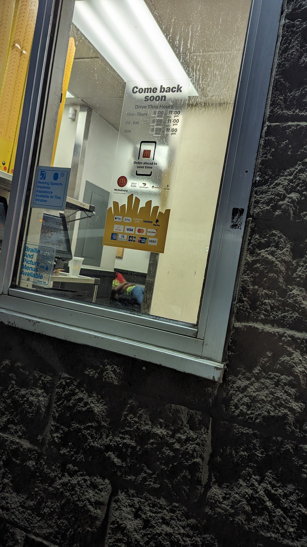 Read moreFriday 12/2 about 10am, I made a Mobil app order and was asked to park & wait for a McMuffin SUB bacon. I also ordered two other items and after waiting 10 minutes, I went inside. It was very busy and I wouldnât normally complain. The female manager/shift supervisor (wearing a blue shirt,) was literally twirling around, and loudly carrying on a private conversation on her cell. She twirled away very quickly the moment she saw me approach counter, so I called out to her. Every other worker was busy, getting things done. She asked me 3 times what I ordered and pretty much was flustered bc I called her out about being on the phone. My order could not be found and she attempted to have me settle for a lunch item (by now itâs 10:20,) and I said no, Iâm trying to eat breakfast on my way to work-which by now Iâm late. I had to tell her 3 times that I ordered an egg McMuffin SUB BACON,) She then mumbled something rude to the cook and also fussed at the person getting the drinks ready for drive thru customers. Because there was no frappe (another HUGE problem,) I ordered an iced coffee with no flavorings or sugar substitute. So black with a cream on the side. Now Iâm late for work and no time to check it. Thereâs minimum ice in the coffee, no creamer. Theres ham NOT bacon on the McMuffin and it tasted so sour that I tossed it in the garbage. Within 2 hours I was throwing up, so the one star is given for the sole purpose of leaving a review with the facts. Although she gave me a refund, it didnât change that I was late for work and didnât have breakfast. I took a bite and spit out the 2nd. Feeling sick all day from either the ham or the hassle. This manager or team leader in the blue shirt needs to go. Not only is she NOT a leader, her rude mannerisms and unprofessional appearance doesnât belong in any position of management of your other employees, and certainly not interacting with your customers. During the entire encounter she behaved as though I had...