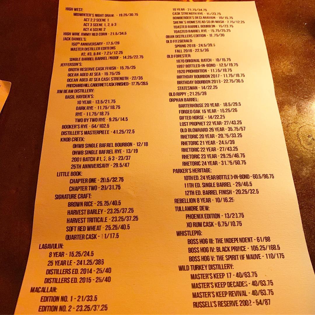 Read moreWe went here last summer and I just rehashed our experience with some clients. Selection was great. Atmosphere is as well. Some would say the drinks are a little overpriced, but I like this because it usually keeps the very young crowd out of the bar (I'm in my 30's). My issue comes with ordering a Weller Antique ($35 bottle) for 8 of us because the price was really good and it would give us time to read through the menu. We get the bill and are charged almost 4 times the listed price... times 8 drinks. The bar tender nonchalantly says "oh yeah.. the menu is wrong. This is the real price." So we argue a bit and finally the manager comes over because we refused to pay the additional amount. The manager makes it right and charges us the listed price. It was a printed menu (very easy to draw a line through the price, or print a new one, or even tell us before she poured 8 drinks). I kept it at three stars because the manager made it right for us. We had another bad experience with a male bartender later that night too but that's too much to go into to. Basically boiled down to the bar tender thinking one of the guys tipped him $0.25 for three whiskeys. He actually tipped $8.25 but one of the other bartenders must have put the cash into the jar (or someone at the bar grabbed it... but this is less likely). Bartender came outside, essentially threw the quarter at my friend, and told him he must need it more than he...