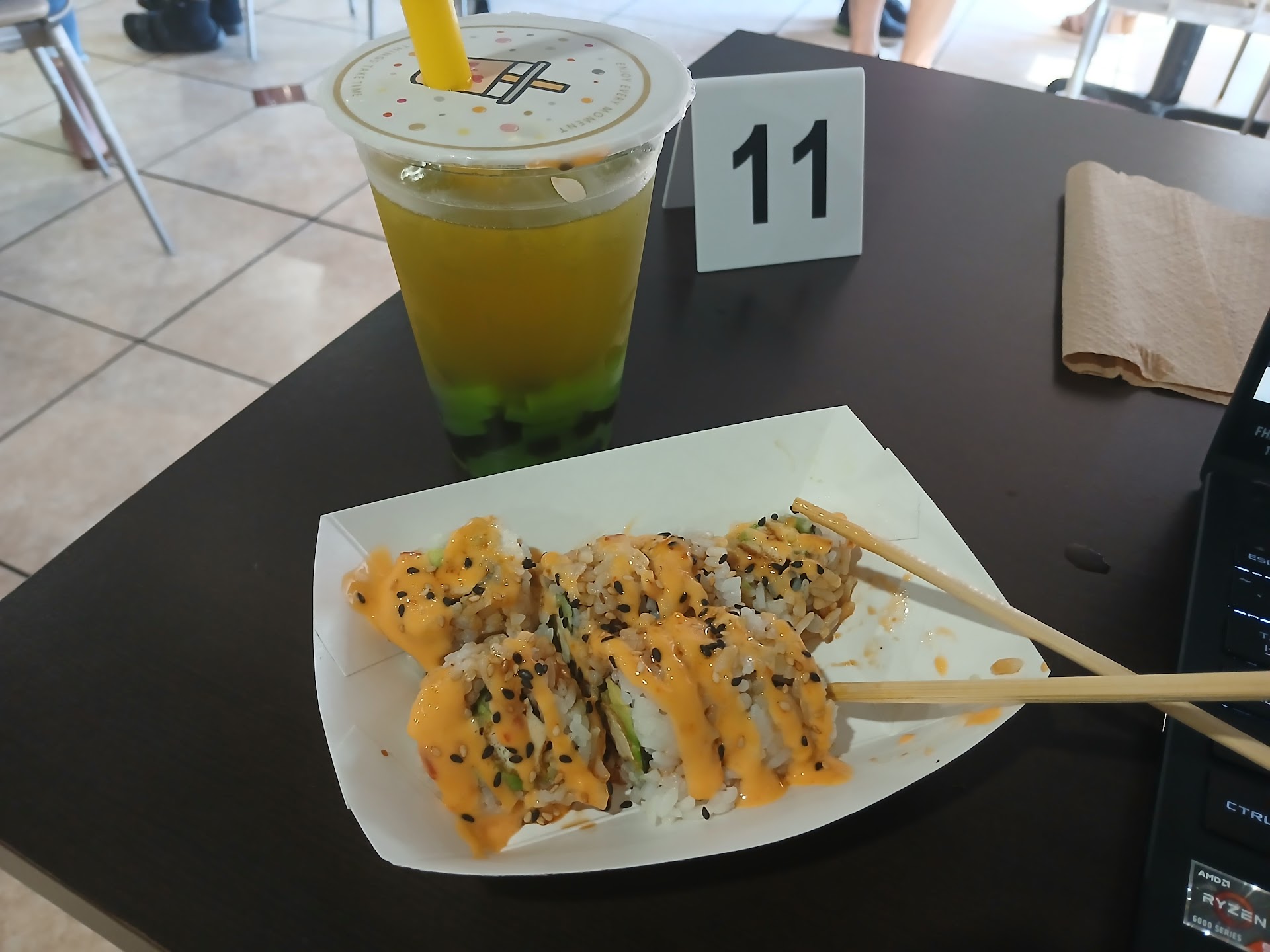Read moreThank you Caleb! I ordered a vegan roll (added spicy mayonnaise because I'm just vegetarian) and a green tea boba with tapioca and jellies. Both were out very quickly, and both were really good! The prices were fantastic, too. I got my tea and sushi roll for just over $13 before tip. Anywhere else and the roll on its own would be $13! I'll be saving this place so I can come back in the future. It's right across from a tattoo shop, which made it a great stop for lunch while I wait for my turn to get a flash tat. The atmosphere is quiet, the lights are dimmed but not dark (plenty of natural light through the front windows too), there's a fish tank, and everything was nice and clean. It's the perfect place to relax and do college coursework while getting good food on a college budget. I'll be coming...