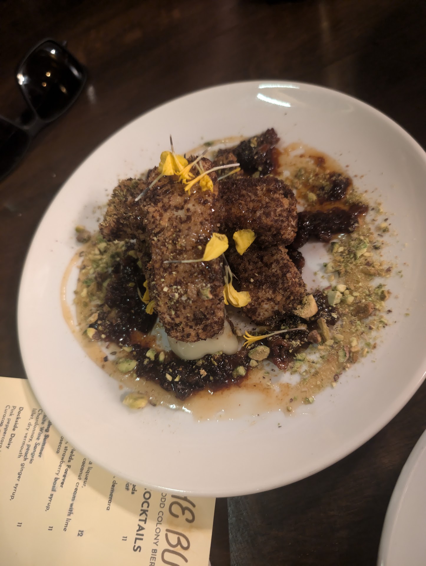 Food: Brie sticks: (pictured below) my God these were good. Expertly fried, and the sauce???? I NEED IT. It was honey and some delicious red stuff.