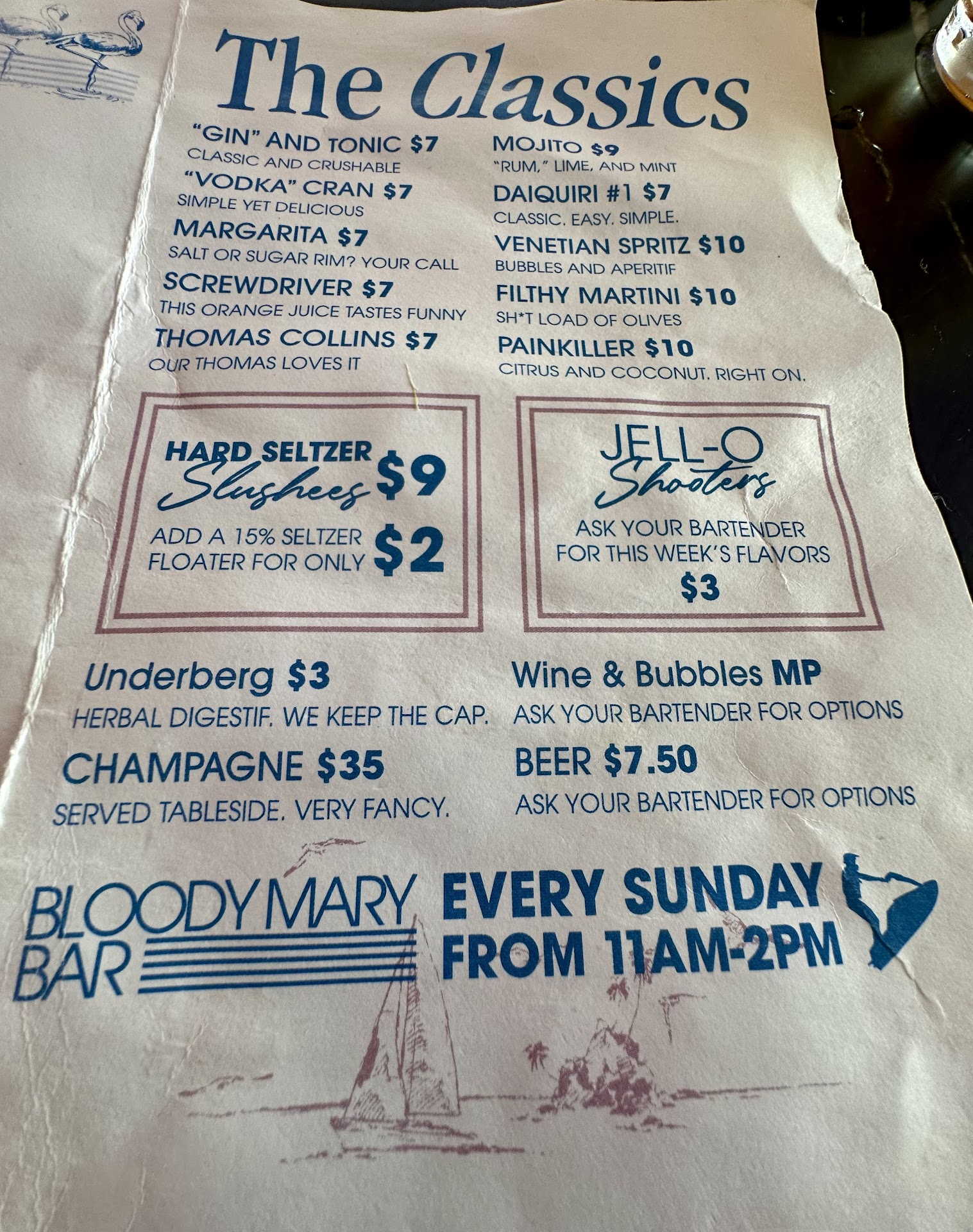 The drink specials are a good deal and taste ok for being “hard seltzer based”. Some folks may have an issue with that but for $3 or $4 you get equivalent amounts of alcohol. Fine with me, if you’re a hardcore with specific tastes may not be for you. The theme is total Miami Vice which is cool.