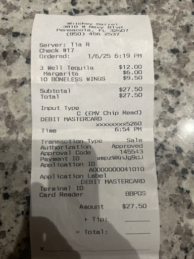 The bar was very nice, the bartender, Tia R was very nice until the end. I ordered a margarita because the price was stated $6 which was a good deal. She asked which tequila I wanted and I went with well. Once I stated I wanted well, she said “you are in happy hour right now so it’ll be $3”. Not once but twice did she tell us the margaritas made with well would be $3. We ordered three margaritas each. We received the bill. I was confused. I asked her nicely twice to explain to me. The first time I asked she said the cheapest she could do was $4 plus $2 for margarita which would be $6. Still no where does that add up to $3 which she explained was the happy hour that ended at 7 pm. Our receipt pictured below has us in at 6:19pm and out at 6:54 pm. So according to her would apply to the $3 happy hour well. I asked her again and i literally said “ I am not trying to be an asshole at all but I don’t understand the charge”. She replied with “I don’t really know what you want me to do about it… I don’t know how to work the system”. Before this we ordered our last round and she was taking shots while our cups were sitting there at her well. Normally I’d have no problem at all. I’m a bartender myself, so I get it. But after that sassy response, we boxed up our food and left. I’m not going to tell you what to do about it, that’s your job. Don’t sell something if you’re not selling it for that price. And then respond with a sassy remark. That was crazy. We left and tipped 10%. The food was very good and the margaritas were good, but we were sold something and then...