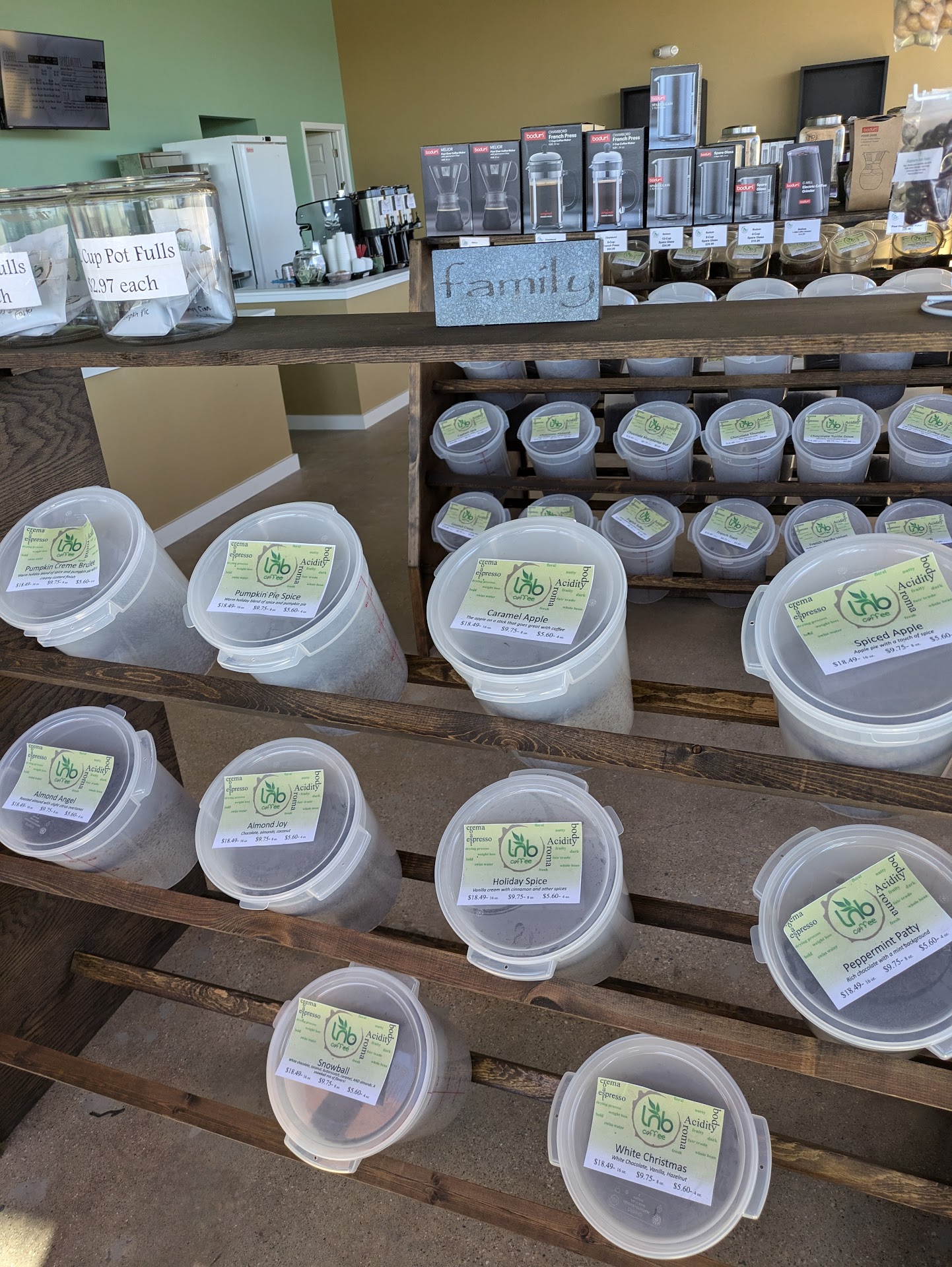 We headed in and were greeted by the best smell in the world. Coffee beans. It reminded me of the coffee bean dispensers they used to have in the coffee aisle at the grocery store. As we walked in, we saw shelves and shelves of coffee bean tubs in a lot of different flavors. There were more flavors and varieties than I could ever imagine. While it would’ve been nice to grab some, I don’t actually have a coffee maker at home. I used to, but I hardly used it as I don’t enjoy making my own coffee as it never tasted right or good. My specialty is drinking coffee, not making it.