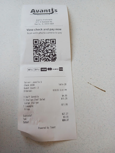 Read moreWe had not been to Avanti's for quite some time and probably won't ever return after this visit. There were not many people at the restaurant, and we had to wait "several" minutes before someone would come to seat us. One of the waitresses even seen us with direct eye contact and still chose to ignore us. Once we were seated our waitress (same one that ignored us waiting at the hostess station) came and took our order. Her attitude was kind of that of a "pissed off person". She wasn't actually rude so to speak... but definitely WAS NOT being welcoming. My wife ordered some lasagna, and I ordered a sandwich & salad. The food came to the table in a respectable time, but the 1st thing I noticed was some sauce from the lasagna was smeared on the corner of the plate that my sandwich was on. There was ABSOLUTELY NO WAY the waitress couldn't have seen it as I believe it was her fingers that went into my wife's lasagna and then she grabbed my plate. Being a food server ourselves and having to take food management courses, we are aware that all plates being served to a customer are to be handled from the bottom without ANY fingers being placed on the surface of the plate where food is placed for service. Not only were the waitresses' fingers IN MY WIFES FOOD.... after my wife got half of the way through her meal she pulls out of her lasagna some kind of foreign object. Other issues we experienced was that this same waitress was asked for a different salad dressing for my salad. She said she would bring it... but she had to be asked again for the dressing as she was now pissed that I had asked a second time, made some loud verbal comment as she walked away and then had a different waitress bring me the dressing. From that point on we were totally ignored from our server and felt like we were being treated rudely for the rest of our time at the restaurant. Upon leaving the restaurant we were on our way back to our vehicle and suddenly a STRONG smell of marijuana smoke hit us in the face. Not that it is uncommon to experience that these days, But when it is clearly an employee toking it up in the parking lot, and then another Avanti staff member comes out and gets in the car with her and starts toking it up... That kind of explains the poor service and poor attitudes of the people working at this restaurant. Our experience was disgusting, disrespectful and TOTALY UNACCEPTABLE!!! and we will definitely not...