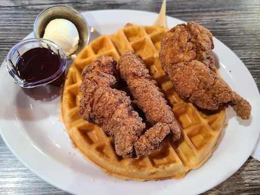 After waiting over an hour for a table, the server comes over and informs us they currently have about a 30-minute ticket time for the kitchen, so if we'd rather not wait, we could find another option. I really respected the honesty and wish the staff in front was more knowledgeable and transparent because had we known ahead of time, we wouldn't have bothered waiting outside for a table. Anyways, we have already waited this long. What another 30 minutes. We get our food orders in and hang out, talking. Most of the food arrives together 50 minutes later at 12:05 where as the last meal (strawberry waffle) arrived nearly 10 minutes later by which time I'd already cleared my plate xD not sure if it was because the food was good or pure hunger from the 2 hour wait.