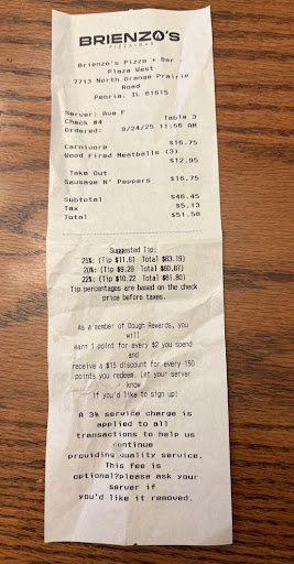 Read moreAt the Grand Prairie location we placed an order of 3 pizzas and an appetizer for carry out. The estimated time for the order was 30 minutes and when we showed up it wasn’t ready. The staff wouldn’t provide answers and we had to ring a bell multiple times to get their attention while they were acting unprofessional in the back. They continued to tell us it was almost ready to keep us around and we ended up waiting somewhere between 30-45 minutes, they had well over an hour to prepare our food and couldn’t get it done. When we did get the food it was not up to the quality brienzos used to be at and they did not make the accommodations we requested when ordering the...