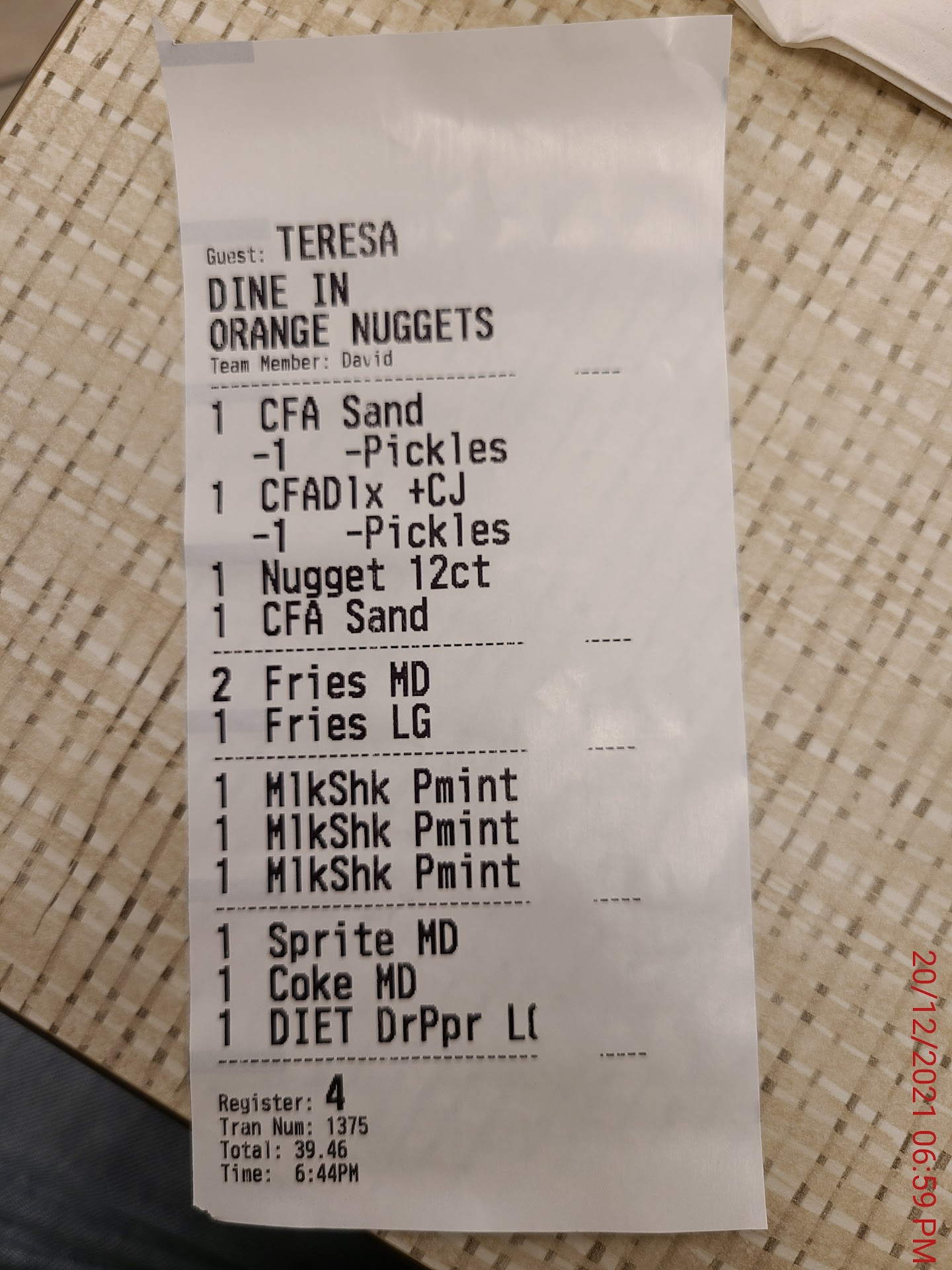Get home and its a DP and 2 Cokes with the kids lemonade. First, dont read it back and tell us you corrected it when you didnt. Cokes were flat. No co2. Total waste of money. Then only bbq and CFA sauce from the second order no sauces from the first order. Again dont tell a lie that you checked ordered it and also at the pick up that you put something in the bag when you didnt. Need to put the orders as they were placed and not combine for your convenience and screw up order like this. You get paid well for a basic job only to screw it up. Keep in mind this is a faith based company WE all should put best foot forward when we represent that. I ask the franchisee to help make quality and service the priority with the training. Mistakes can happen but lying and telling someone you did something is not acceptable.
