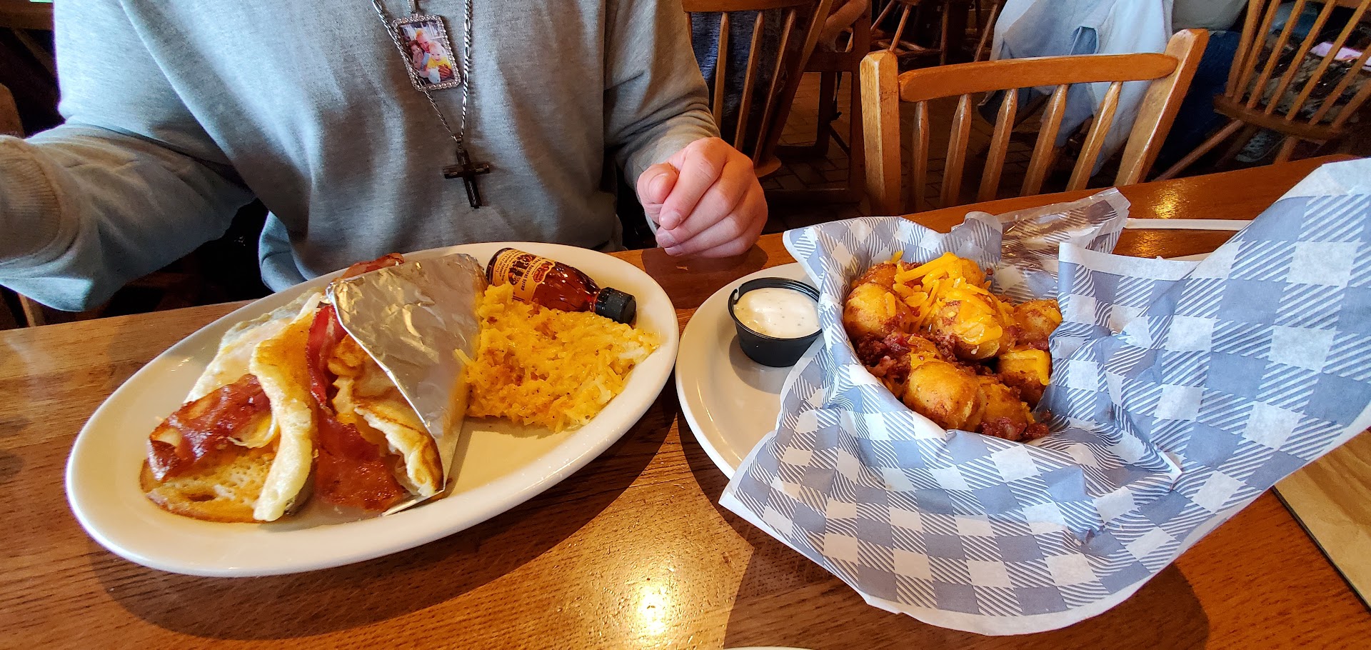 Read moreCame here for breakfast while my car was being serviced. It started off at the host station getting a sales pitch on the specials of the day. She didn’t like it when I said that I don’t care for that, and asked to be seated. Not happy was she as she walked away once at the table. Tori (Victoria) was my server. She was fine in taking my order, and checking up on me to see if I needed anything else. For breakfast I had the Grandma’s Sampler with pancakes. Instead of the sausage I had opted for another strip of bacon, along with the sugar cured ham, and a side of apples. Everything was fine. Eggs, bacon, ham, pancakes, and apples. To drink there was water and orange juice. I had a relaxing time for the most part. When it came time to check out, standing in line was a discombobulating experience. Both registers were tied up as one couldn’t check out a person as the ticket that was shared was open on the other register. Why they didn’t handle all who sat at the same table at one register is beyond their logic and reason. Upon the next customer waiting in line, they suddenly stopped and walked away to do more shopping. Why would you make others wait while allowing a customer to continue to shop was a new level that defied logic and reason. I had to walk away to use the bathroom… that’s how long of a wait this was turning into. I returned, and was finally able to check out — thanks to another lady who noticed I was waiting before. I asked to speak with a manager, and shared all that had occurred. The best he could do was to say he’s “sorry.” Well, I’m sorry that you’re sorry; and find it poor service, rude, unprofessional, and insincere. Would I come back after this experience? I may. But I’m going to keep this experience in mind.