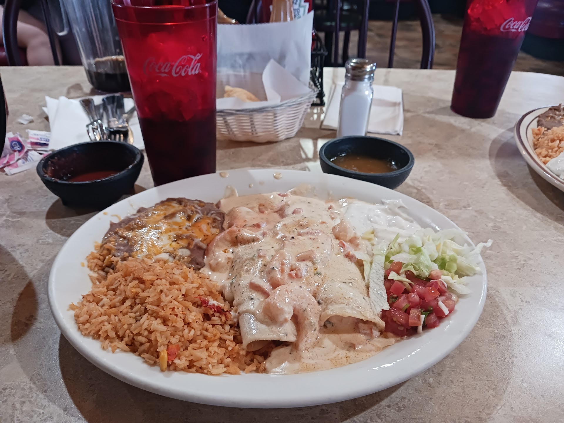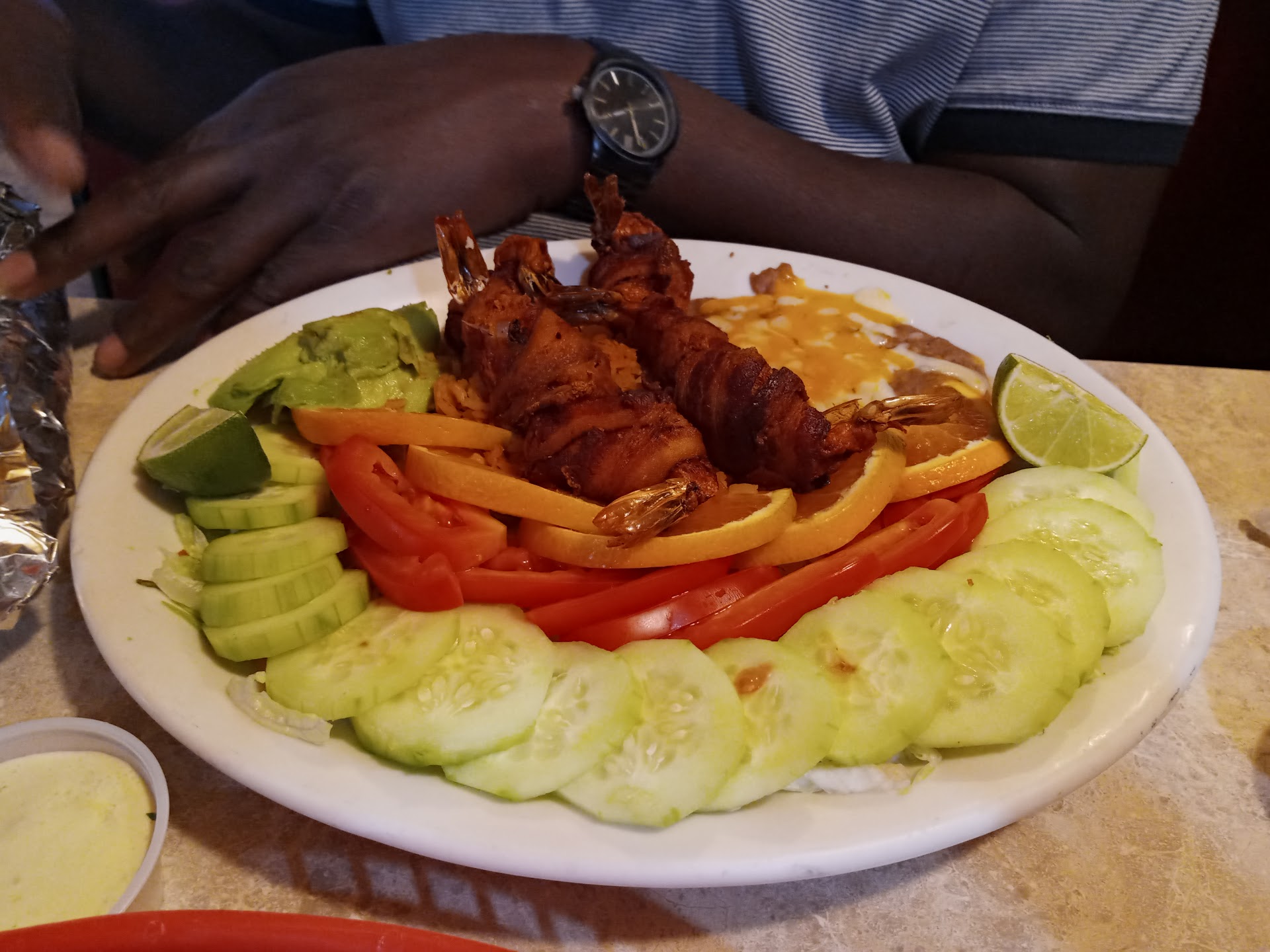 We ordered the camarones imperial and the chile relleno con pollo. The guacamole was exquisite, full of rich flavor and hearty! It is actually the best I've had in the area! The bacon-wrapped shrimp was muy rico. The fruits and vegetables it came with were very fresh and a complimentary flavor with the shrimp. The stuffed chili was sabroso and had a lot of cheese! The chicken was not as good, but it was finely shredded and wasn't dry at all! The carne de vaca y frijoles tasted very fresh and authentic as well and was not over seasoned.