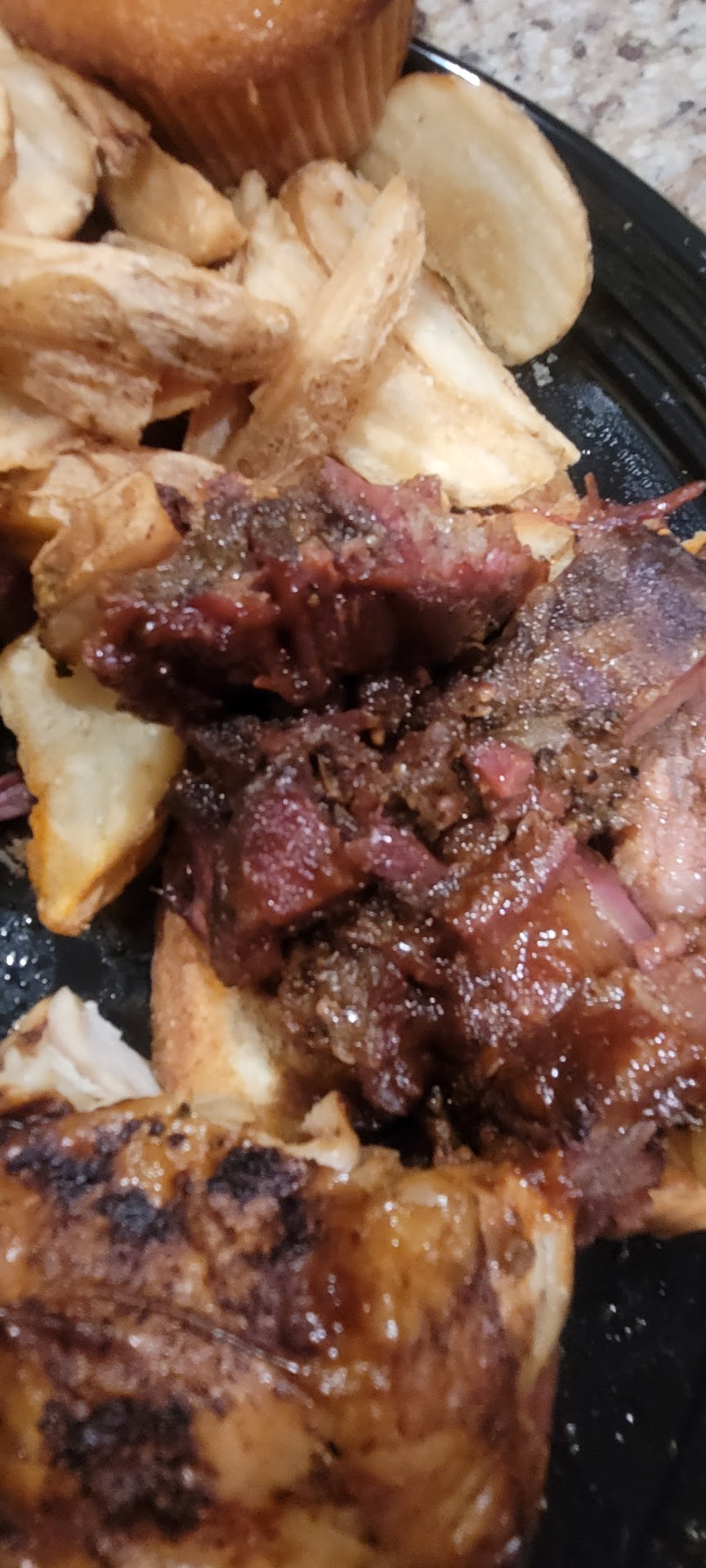 I think my partner got some ribs. I don't remember what kind but they really liked them! The muffins we got were to die for. They were so good. I wanted to get another so badly but I wanted to try a desert too. XD the desert was the special named Dave one and it was fantastic! It had ice cream, whipped cream and really tasty insides. I definitely would have to get that again