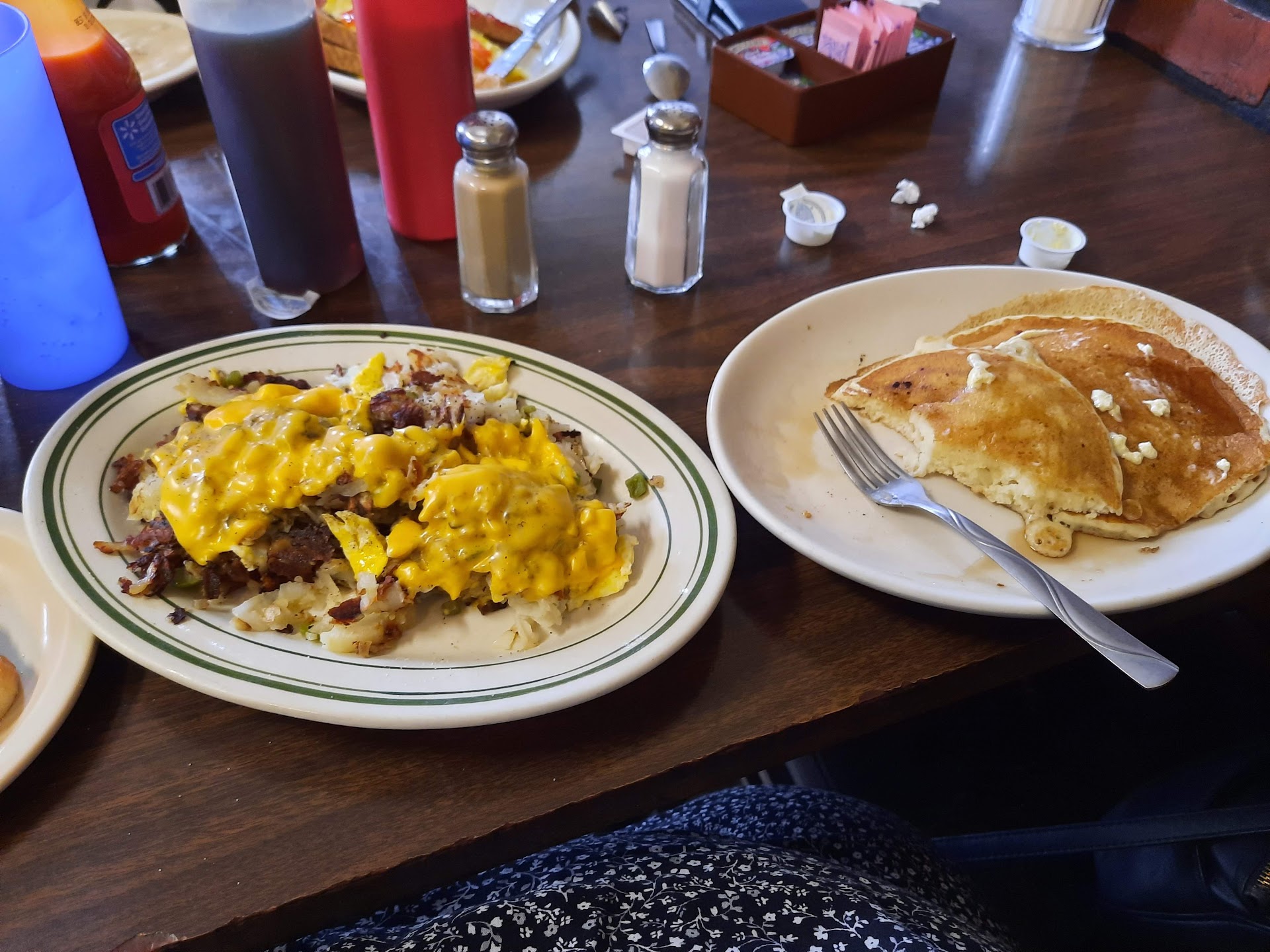 Read moreFood like someone's favorite family member made it like... good good😍🤤😏🍽☕🫖. Had the skillet with cheese. The onions🧅 potatoes🥔 and green pepper🫑 were well seasoned and the cheese🧀 was American melted 🤤😍 side of a short stack🥞. My manfriend had a bacon 🥓and cheese🧀 omelet. He loved the bacon🥓 was whole folded with the cheese🧀 into the omelet, crispy enough to easily cut into but not too dry. Hot sauce🌶 on the eggs🍳 and a half order of biscuits and gravy, which was better than I make. That breakfast anywhere else would have been $35- $45 but this place was an amazing value 🤑 Staff is funny and friendly. Regulars make the...