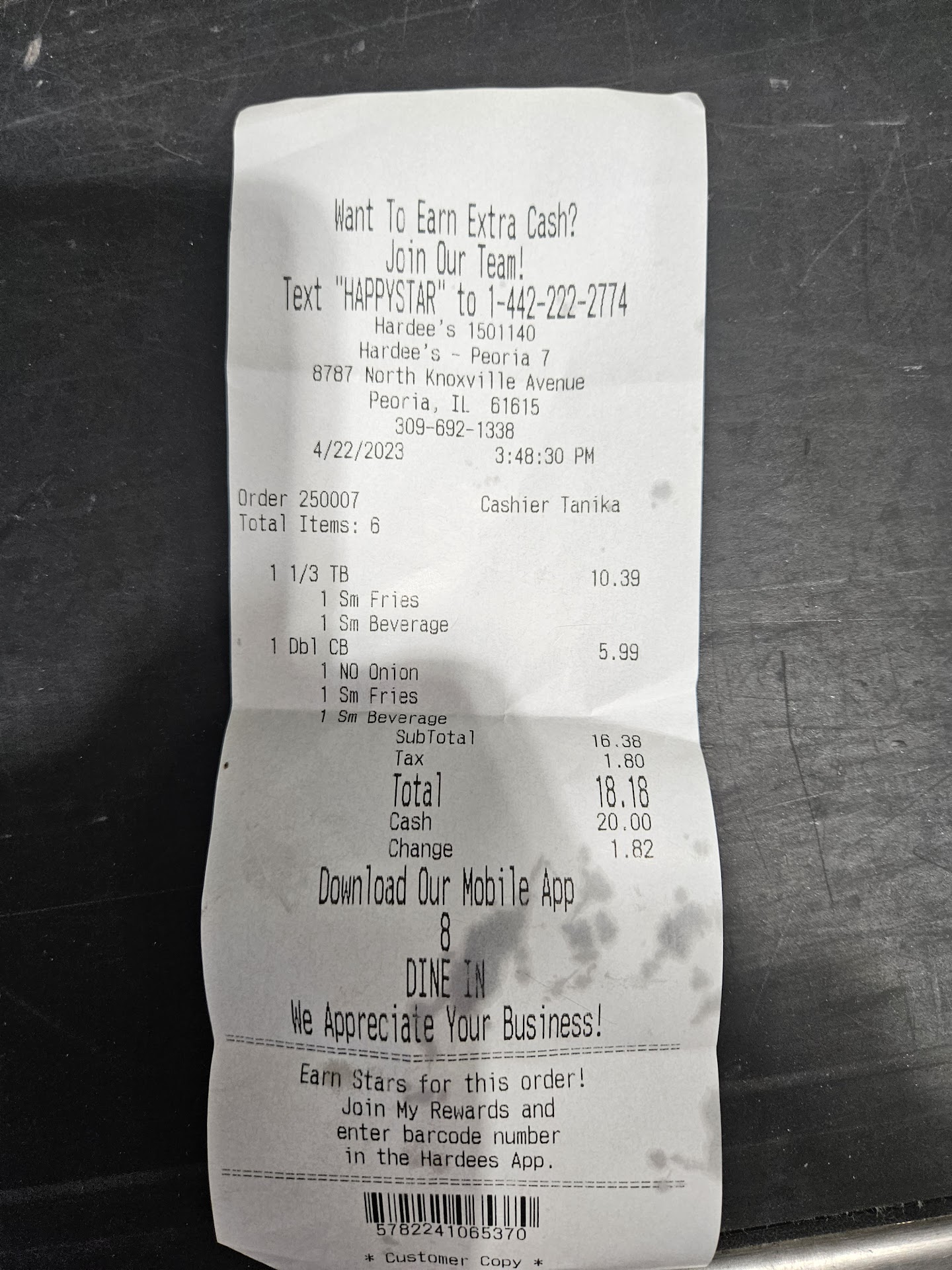 Read morePerson at counter was not a people person. Bordering on rude or put out, angry like? She was quite efficient though. My burger meat was dry and then way too much mayo, great globs of mayo. Enough for 2 to 3 burgers. I didn't like the 8 dollar burger at all but the fries were fresh and hot......plus good. Sorry but that experience wasn't good as a whole, gave me indigestion and turned me off of Hardee's and it's over priced burgers. I wish I had thought to take a pic of the burger patty and the hreat globs of mayo. I didn't even order mayo and wouldn't have. It literally gushed out when I took a bite, oozing onto my hands and falling to the table below. I scraped off a quarter cup and left behind about the...