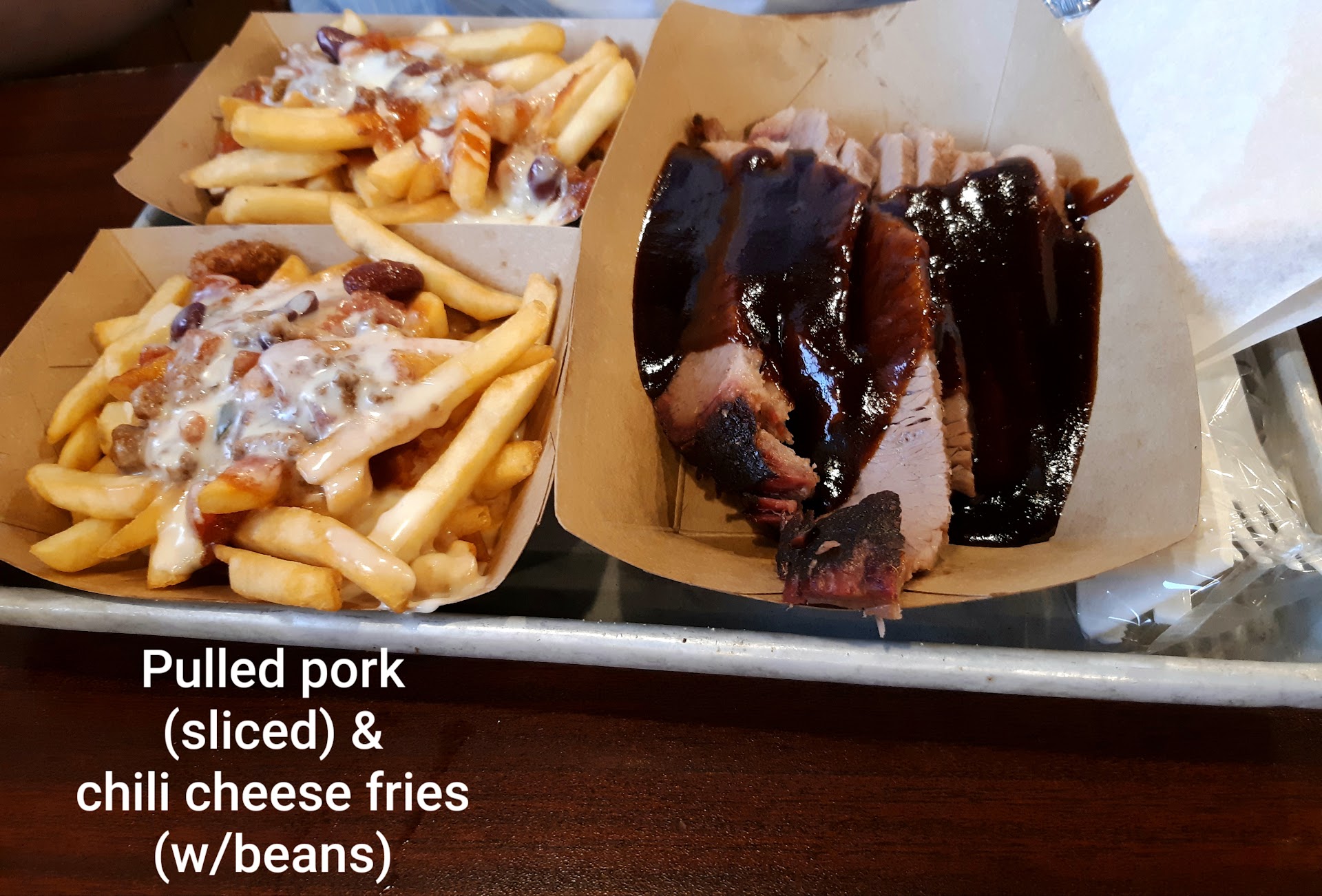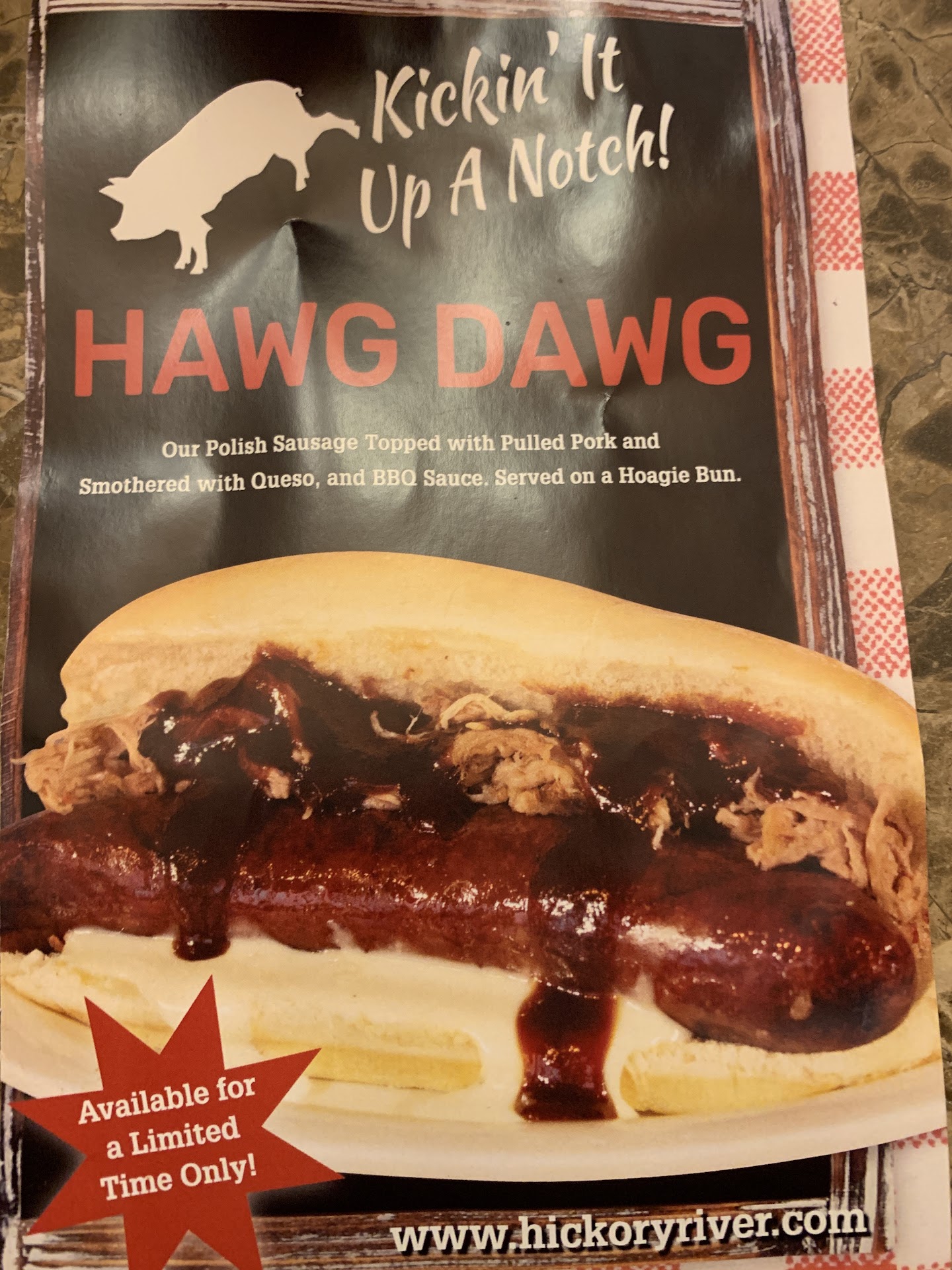 The Pulled Pork is great. It has won multiple State Fair titles. I also like the Beef Brisket and the Baby Back Ribs. You canāt go wrong with either the Hot or Mild Sauces. The undisputed Hickory River Smokehouse Champion is The Cue Shoe. This dish will knock you out into a food coma. I am a big guy and I struggle with this mountain of culinary love. The foundation is Texas Toast then a heap of Pulled Pork soaked in your choice of sauce. Next they top it with French Fries and smother it in a delicious white cheese sauce.
