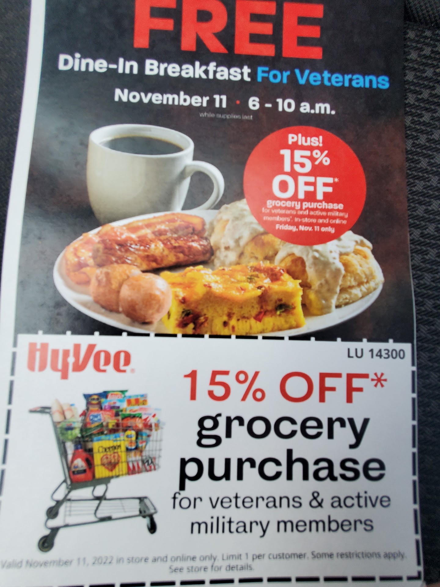 Once again Hy-vee has impressed me. If you are a veteran or active duty military go to Hy-vee on veterans day. I can't say enough. From hy-vee employees to the Manual high school JROTC members there . They greet you at the door. Thank you for your service (a genuine thank you) give you a coupon for 15% off of your grocery purchase. They give you a Hy-vee military challenge coin. Then they serve you this awesome breakfast from the buffet. Everything from delicious rolls to eggs , fresh fruit and all the traditional breakfast items. Lots of veterans here this morning enjoying this amazing breakfast. A special thanks to the Manual high school JROTC and their Commander Davis. Semper Fi to all ! Thank you...