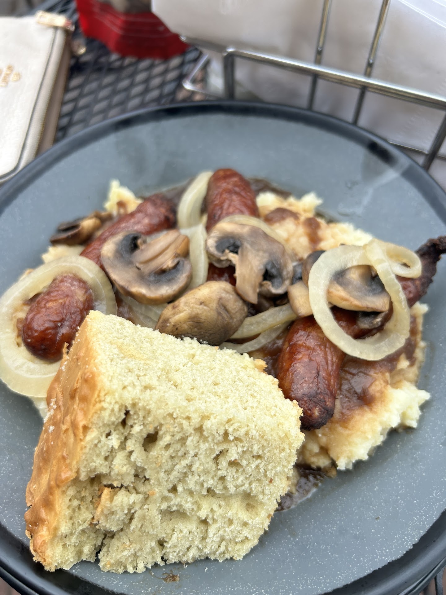 Read moreComing from out of town we were excited to try a local venue. We loved the idea we could sit outside with our dog and have lunch. I only wish we could have gotten the young lady who came over and spoke to us about our pup and the street block party that night as our server. Instead we received a complete opposite. Rachel our server was not friendly barely looked us in the eye. She came back 3 times to ask us what our order was but barely giving us time to review the menu. She rushed us the entire time. Mind you no one was sitting outside and hardly anyone was inside. My husband and I both ordered beers. Hard to mess that up. Nice and refreshing on a warm muggy day. We ordered an appetizer crab balls almost like, but hardly and crab and tasted of the oil they were cooked in. Bummer, was looking forward to those. Then I ordered bangers and mash. It’s and Irish pub and I wanted something not a burger. It had no flavor. I was shocked. It presented well and looked pretty, but no flavor. Gave me incentive to go home and perfect this dish because I was so disappointed. My husband ordered the Irish trio. Interesting. I have never seen Chicken pot pie come out as soup and look like it just came out of a can. Again no flavor. I am beginning to think the chef forgot spices. The shepherds pie looked more of a normal dish but again no flavor. Blah on everything, except the soda bread. The bread deserves praise, maybe they don’t make it in house. The kicker was when we got the bill. I ordered a piece of chicken breast with nothing on it, no sides just a piece of chicken that I could cut up for my pup. Who enjoyed the chicken. $16. All it was was one chicken breast- nothing else on the plate and it cost more than my meal and my husband’s meal. Honestly I should have said something but our waitress who seemed to have woke up on the wrong side of the bed, was not friendly so I just paid it and we left. I would maybe try the place again for beers and music, but not food or...