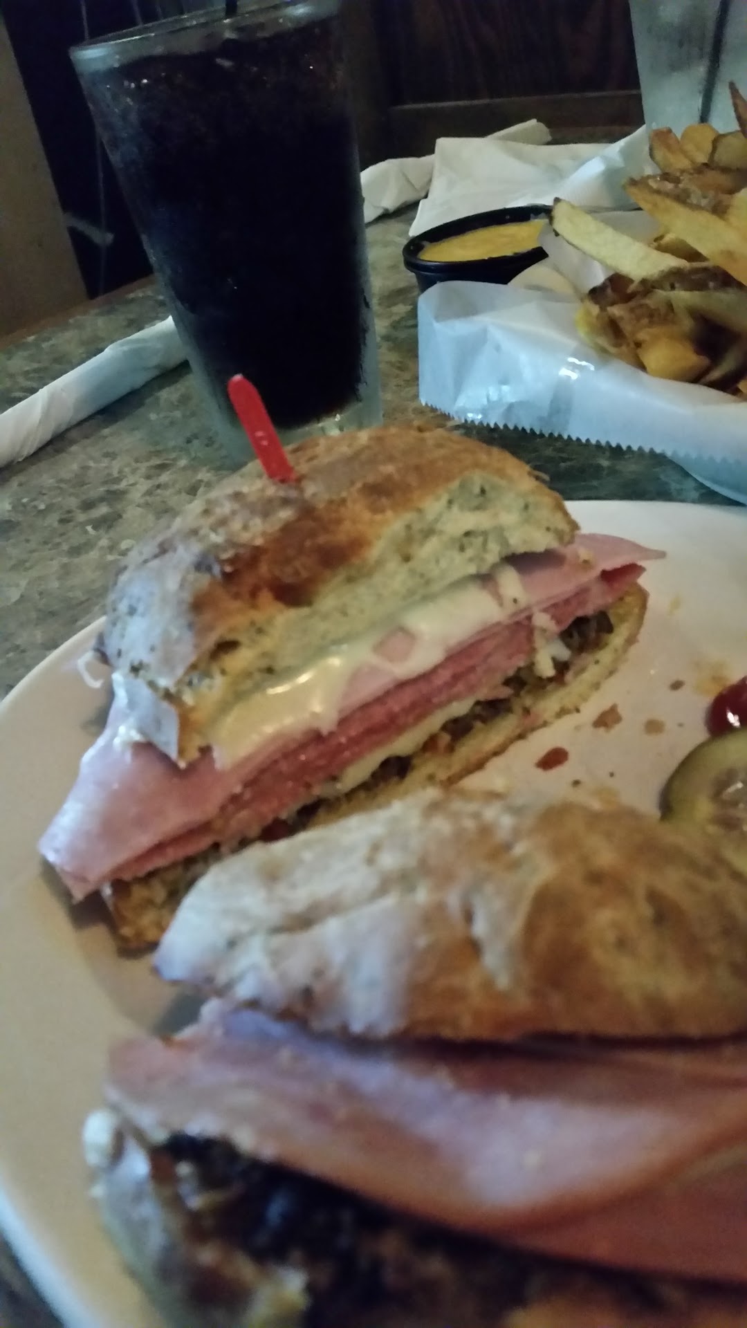 "Ozzie"tizers- Down Under-2 Big Potato Skins topped with cheddar cheese and Bacon. I would say these are the perfect blend between the thickness of the potato and the crispy skin. The bacon bits are packed with flavor. And last but not least the melted cheddar cheese.If you like potato skins you need to try the Down Under. Aussie Fries- we got the (bowl) to share among the table. The fries are really good and they pack that bowl full of those delicious fries. Bugalug-Grilled Portabella Mushroom Cap onions and green peppers topped w/mozzarella cheese.This was my wife's main coarse and she ordered it without the peppers and onions. She said it had a really good grilled flavor and a load of cheese. Overall she really liked it and would get it again.