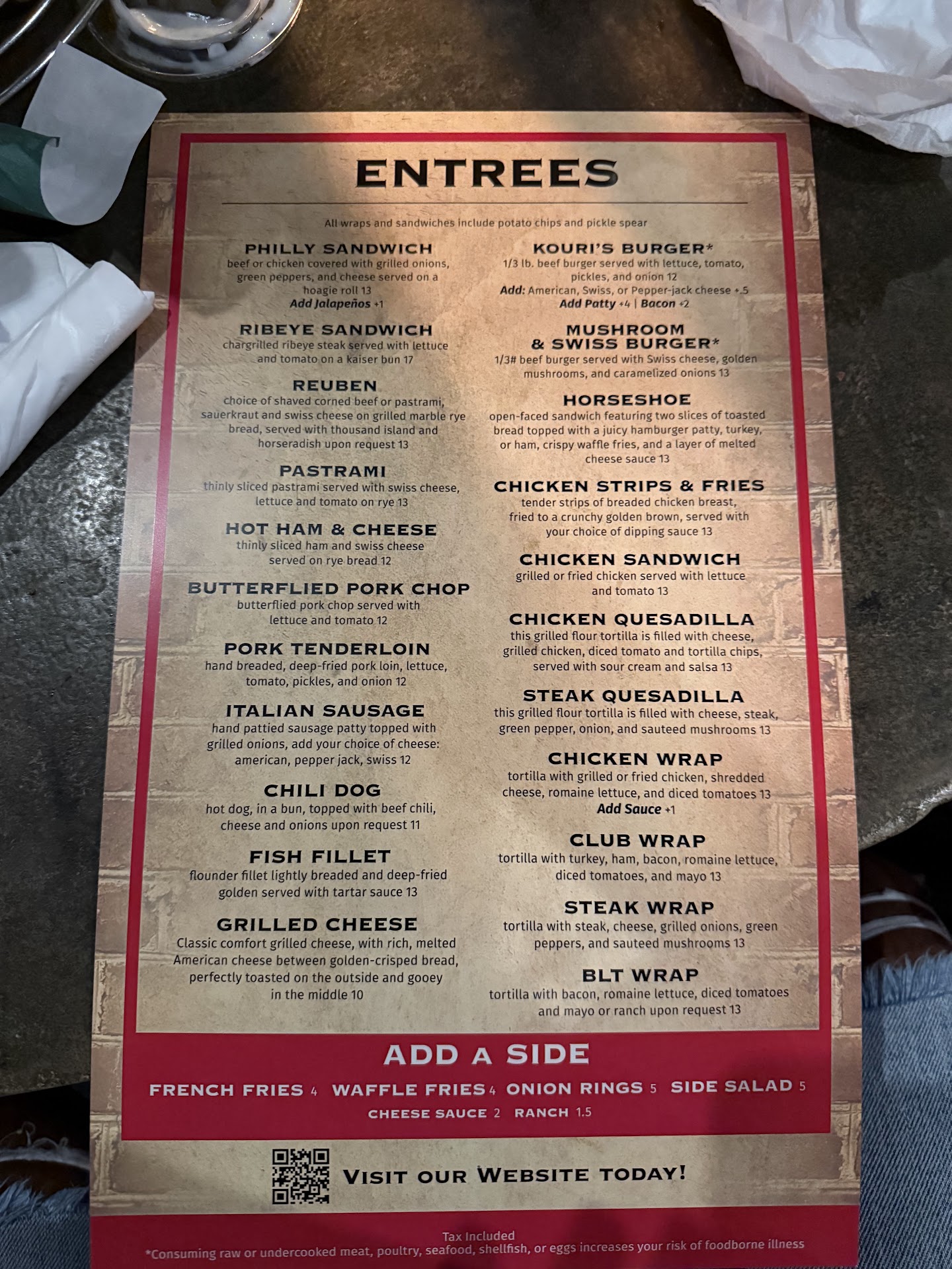This was my first time eating at Kouri's Pub, I was meeting a couple friends there. My first thought was how cool this place looked. Absolutely love the indoor/ outdoor fire pit, all the seating and the fact that you could practically be outside and still be covered. I was really impressed with the whole layout of the restaurant on the outdoors. The inside was nice, though I thought it was quite dark and most of the lighting was kind of red tinted. I was surprised it was that dark for it being around 1:00 in the afternoon so I was glad that we chose to sit outside. I included some pictures of the inside and lighten them so you could see what the room looked like. There weren't many people there, 2 couples when we walked in and then three more sets of people came in after we ordered. There was still plenty of seating and it was a beautiful day! I ordered the chicken sandwich and my friends both ordered the chicken strip baskets. The sandwich meals only come with chips, if you want to get french fries it's a $4 upgrade. The chicken strips came with french fries so I just tasted a few of theirs. I don't really try to write negative reviews so I look at it as a way of helping. My honest review of the sandwich is good... it was tasty and not too chewy although lacking flavor. The chicken strips were actually a bit tough as if they were overcooked and also lacking flavor. Honestly, they tasted just a little bit scalded on the outside as if there wasn't enough breading so they tasted a bit rubbery. The french fries, also lacking flavor, I don't think they use any seasoning on them, I'd love to see some sort of a Cajun seasoning in the future, I think that would be really popular. All around I mean the meal was okay, the service was good but I think that adding some seasonings to the mix would definitely shake things up a bit. Again, I absolutely love the layout of the restaurant the whole outdoor seating is just absolutely beautiful so 10 stars on that one! I'm honestly not sure if I will return but if I do I'll come back and update my review. Have...