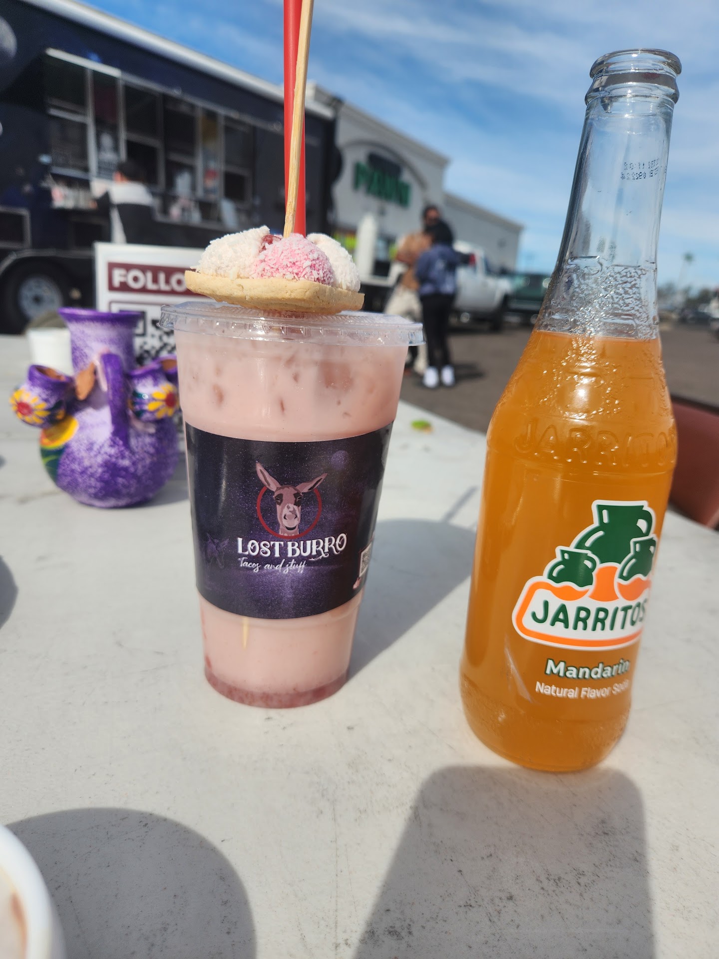 Read moreIt's Taco Tuesday and I just want to say that I have found the BEST tacos! These are amazing tacos and the best I have had! I found this place on Yelp awhile back and just haven't had the chance to go yet, but did today. This is a food truck called Lost Burro and they are usually at this location, 83rd and Peoria Ave. It's not in Surprise, but a close and short drive. We had the quesabirria tacos, carne asada/steak tacos, al pastor taco, smoked beef taco, and shrimp tacos. The carne asada tacos were SO flavorful! They come with an avocado crema that's awesome. My husband said the al pastor was the best he has had! They had pickled pineapple on them. I also had the shrimp tacos and I loved them SO MUCH! They look spicy with their coloring and spices, but they were pretty mild. They also had walnuts on them, which I thought gave them a nice crunch. The quesabirria tacos were delicious! We also had refried beans (I forgot to take a pic) and I liked them; they have a little spice and kick. My husband got the strawberry horchata and he said it was so tasty and refreshing! I thought it was really cute how they presented it. The smoked beef taco is so interesting and something I haven't seen before but it was delicious as well. These are the best damn tacos! They alsp have other things on the menu, like burritos, quesadillas, nachos, and other stuff. The customer service was great and they checked on us multiple times and helped us with the menu since we were new. I keep thinking about them and am already planning my return. You will not be disappointed! 😋🤤🌮🌯