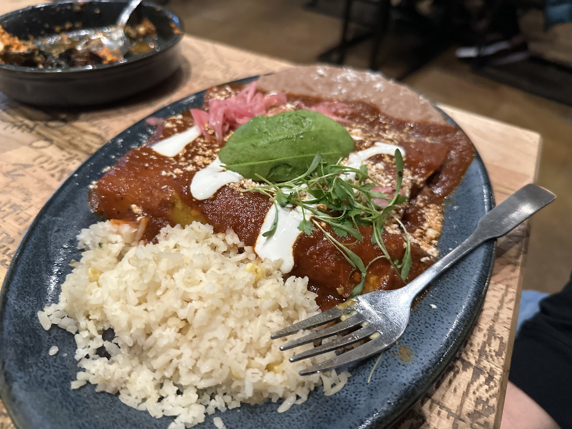 My main course plans hit a snag when I learned the red snapper was unavailable. Disappointed, I chose the Mochilero Mole instead—a savory dish of chicken breast in mole, sprinkled with toasted sesame seeds and served with pickled vegetables, black beans, and rice. While tasty, my heart had been set on the snapper. My friends' burritos, on the other hand, were massive and met with rave reviews all around.