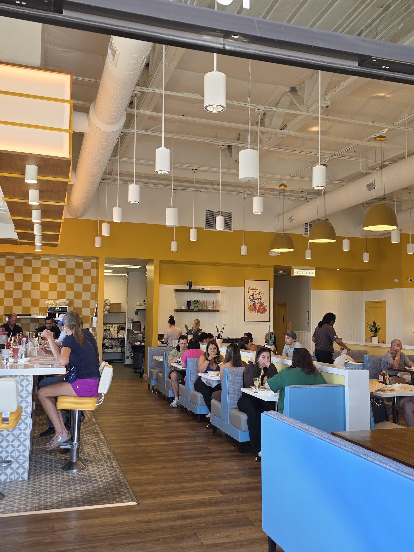 Read moreThis was a pretty good breakfast restaurant. The decor is very brightly colored and gives feel good vibes. I loved the bathroom wallpaper (might be weird to say but very few places think about every inch of their building) and all of the positive saying throughout the restaurant are great. The food was really good. I got the chilaquilles and got both the red and green sauce. The green had a little spice and was full of flavor, and the red was not spicy at all to me but had lots of smokey roasted tomato flavor. They were both delicious. My son got the kids waffles. The waffle was a pretty big size, tasted good and came with a side of fruit, which surprisingly ended up being all berries, one piece of applewood smoked bacon, which tasted amazing and a drink of his choosing. He got the strawberry watermelon lemonade. It was very light tasting but super refreshing, our 4 year-old loved it. They also give him, wikki stix with his menu instead of crayons and he was entertained the whole time with them. We had never seen them before and they were very cool.