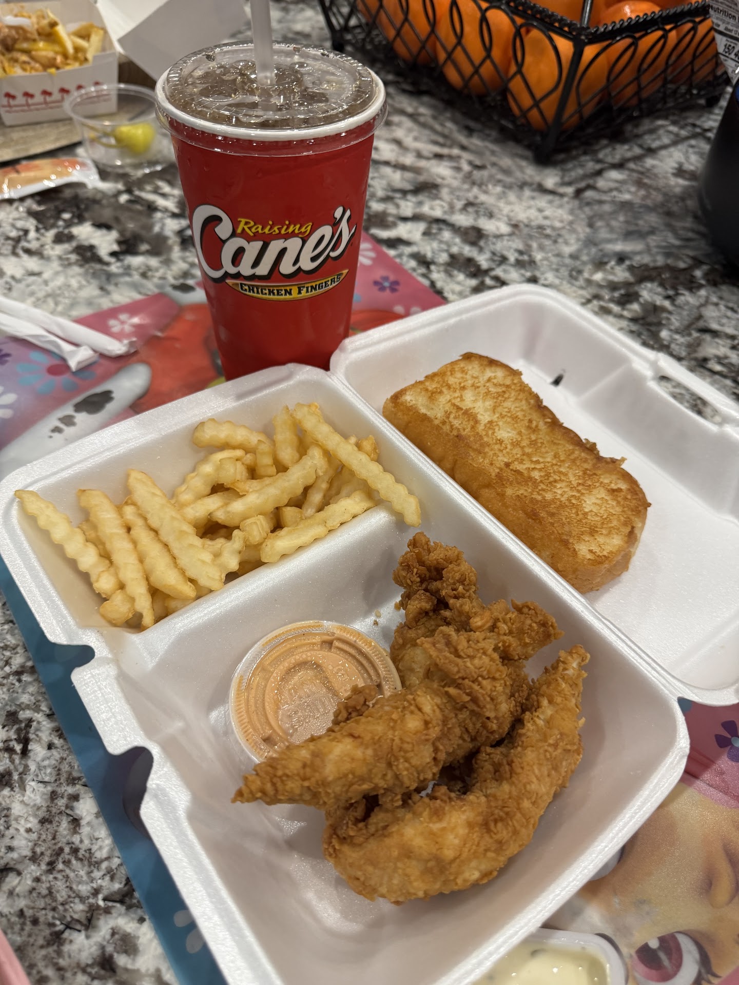Read moreI wasn't sure about canes at first, but they have won me over. They're a little bit pricier than I would like. And I don't like that the chicken fingers if I get the same amount of chicken fingers in a drink and fry It's the same price if I get the combo with the coleslaw and toast with it as well. So I usually get the combo but I do not like the coleslaw or the toast so that just goes in the trash every single time. It would be nice if they offered combos that didn't have the coleslaw and toast.