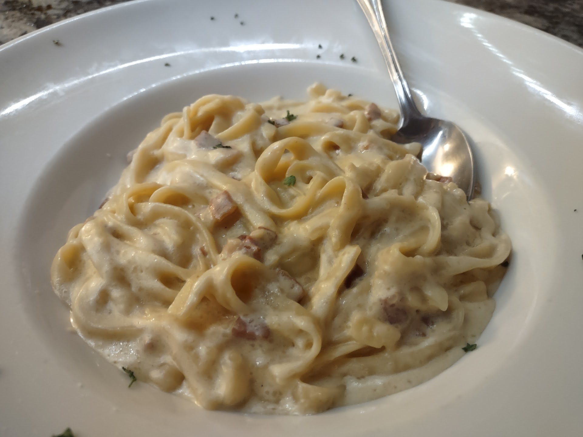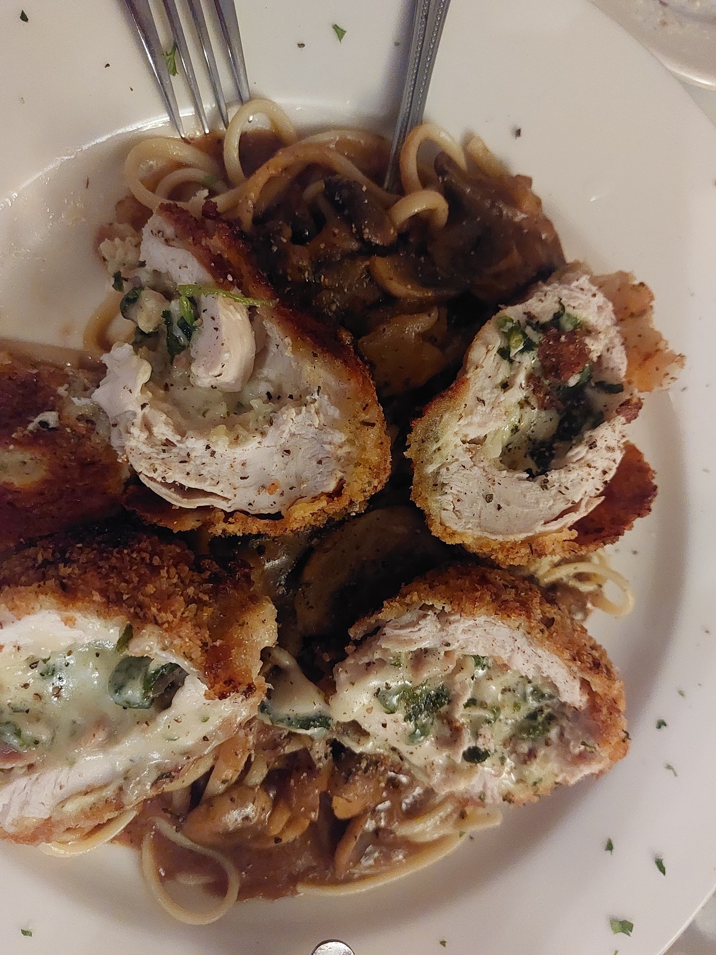 We had the Veal Sorrentino and the Pesto Crusted Salmon with the house pasta. The sauce for the salmon was excellent as was the pasta. Big, wide, ribbony noodles--I will taste that again! Both the fish and veal were nicely cooked and the plates were lovely to look at.
