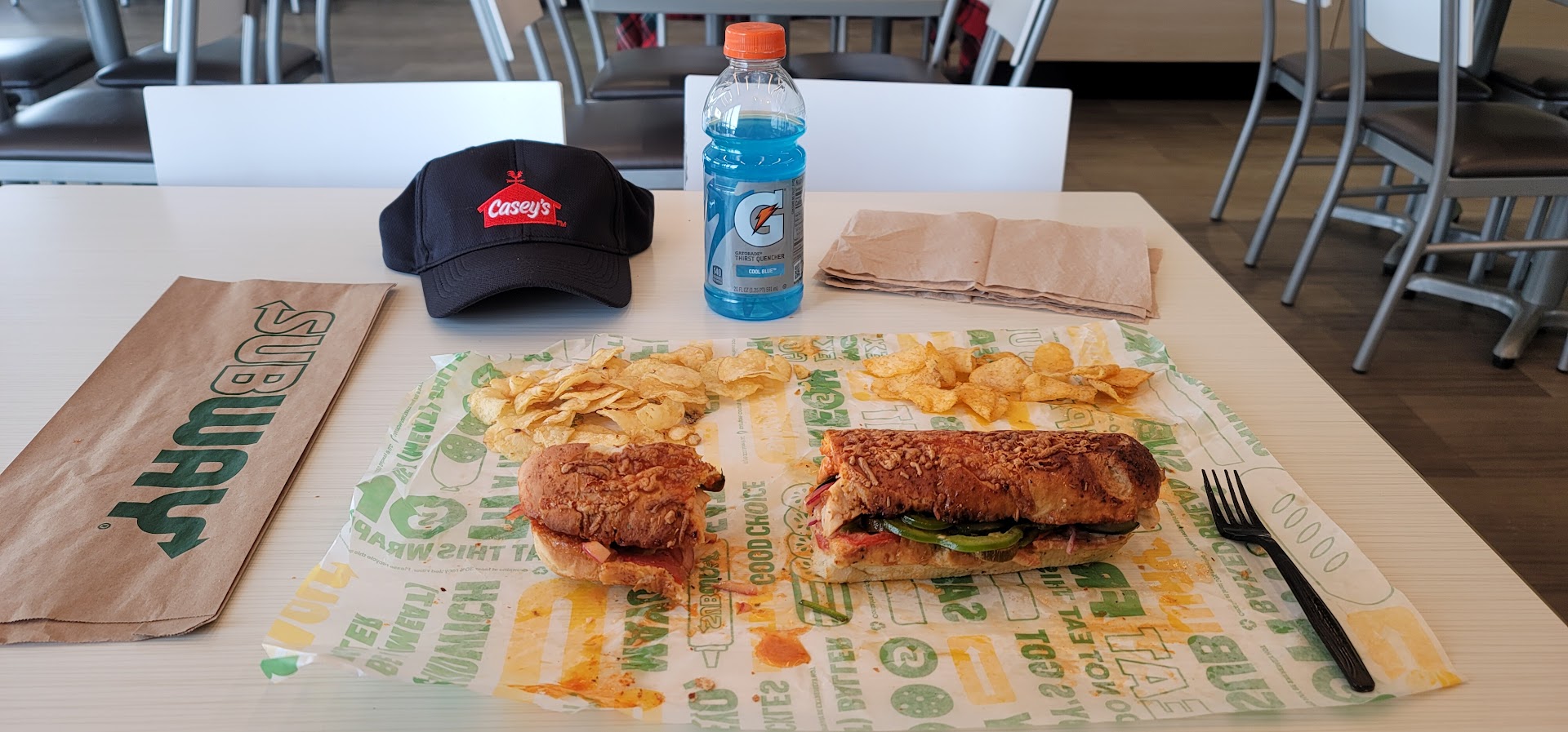 Read moreDon't go on lunch break. I went with only one car ordering at the drivethru window and one car in the parkinglot. It still took just over 15 minutes to get done with my food (I know exactly, because I had an active timer for my lunch..). On top of that, I ordered a Turkey Bacon Guac wrap and a bottle of water, which totalled almost $18! I asked him about it in the window and, my fault too I guess, he said he couldn't find that wrap and didn't know what I was talking about. It's been a while since I ordered it so maybe subway doesn't have it anymore? Who knows, because he didn't even try to care or even apologize for the wait, the cost, the misunderstanding, nothing. Unfortunately, I can't afford $18 for a 6" wrap and a water, but they had already taken so much time I didn't have any time to order something different. By the time I got out of there I had just enough time to drive to work and be late clocking back in...no time to eat. They had 3 employees on staff and it took you 15 minutes to get through one order?? When I could sneak a bite I notice they didn't even heat up the bacon on my wrap, and over half the wrap has no veggies (I ordered 5 different veggies, there should be some..) Pretty...