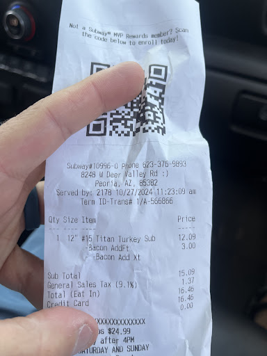 Read moreBeen to this location 50 times at least before throughout the years. But this last time was off the charts horrible. I walk in and was ignored by a male sandwich maker as he finished sweeping the floor. When he was done he put his broom down and put on his plastic gloves without washing his hands first. So the hand that touched the filthy broom handle was tugging on gloves that were going to directly touch my food. This remark isn't about Covid..its about basic health and sanitation. All food was contaminated after this stupidity. But I said nothing....I showed him the mailer coupon (Two 12" subs for $12) I had....as I was paying for the meal another male employee was shown my coupon. 2 drinks. Cookies and the 2 subs came out to be $36.83 total. I asked "How can this be?" and that's when the females condescending attitude came on full force. She accused me of not showing the coupon beforehand with a snarkey tone. She didn't ring up my order correctly either. New total was $24.53. That's a big difference! BTW two of the three employees talked all while my sandwiches were being made about the night before customers, unhappiness and general bad attitude you don't discuss in front of customers. Maybe this is just a post pandemic bad group of employees that need editing. But regardless, I'm going to hit the other subway until I think enough time has gone by to resolve all of this subways many...