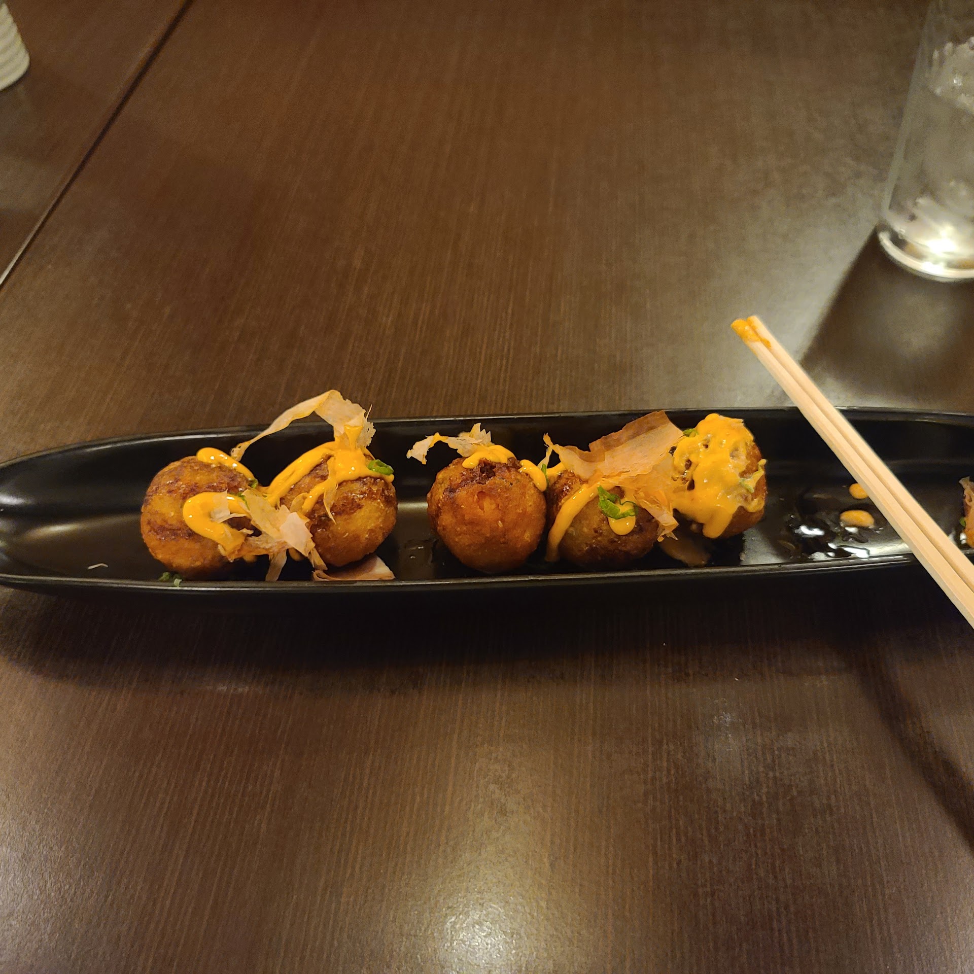 Ā Ā Ā Read moreYet more disappointing food here in town. The takoyaki was either very overcooked or reheated, the octopus was far to dry and chewy. Also, they used a spicy sauce instead of the normal sweet sauce takoyaki traditionally has on it. I couldn't force myself to eat it all. And the presentation was very bizarre, being arranged on a narrow, deep plate.