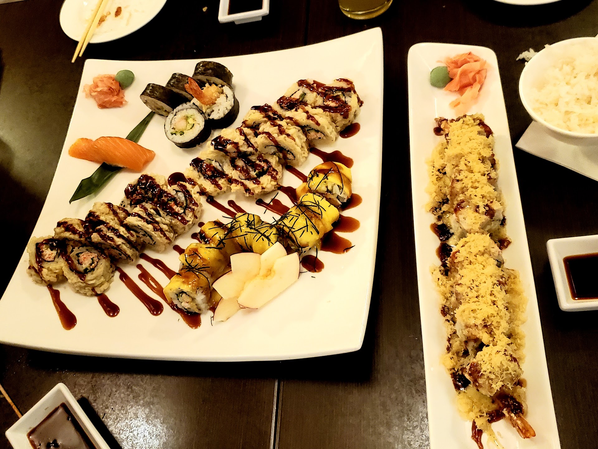 Following this up, the presentation of the sushi was bizarre as well. I ordered the spicy crunch roll, and over pice was on its side topped with far too much tempura? Even stranger, the "spicy" roll was no where near as spicy as the sauce on the Takoyaki.