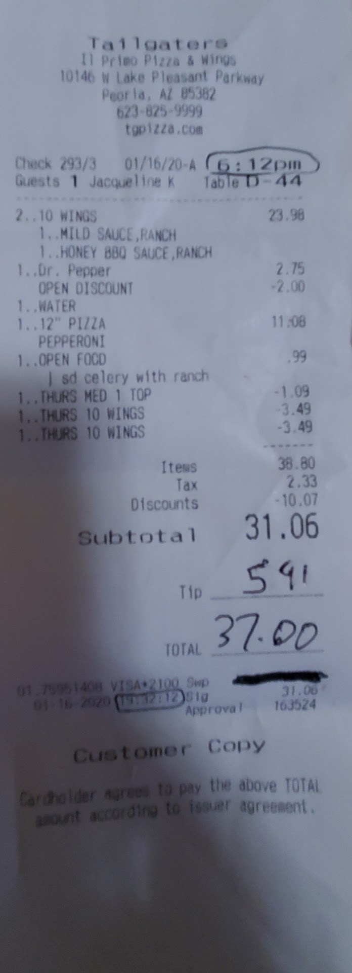 Read moreIt's pretty clear ownership/management isn't monitoring this page, but if you're a consumer thumbing through reviews I hope you'll take a minute to read. If you're not a reader, our visit for 2 adults and a 16 month old took over an hour and 1/2 AND we were overcharged. We arrived about 10 minutes til 6pm on a Thursday night. We were sat promptly and we placed our order was submitted at 6:12pm. All day special on Thursday is large 1 topping pizza for $9.99 & wings .75/each. Our pizza arrived at 630pm, not a long wait. However, when the pizza was dropped off we were told our wings would be out in a few minutes. Almost a half hour passed, we finished the pizza and our server actually attempted to drop off our tab! We told her we were still waiting on our wings and a manager would also be out to speak to us. The wings came out minutes after that, and the manager followed to apologize for the wait. I though he may offer to comp the wings or offer a discount on a future visit. Nope. Roughly ten minutes after that our son decided he'd had enough, and it was time for us to leave. Around 7:15 I finally received the check, and to my surprise not only did the manager not comp anything, BUT WE WERE OVERCHARGED?!? $23.98 regular price for 10 x 2 wings plus two $3.49 discounts. Check out the receipt for yourself! It's not about the $2.00 we were overcharged, but EVERY customer that ordered that special has been overcharged...nothing like padding the 'ol stats there. I alerted the server and her response to me was "we just push a button". SMH. After waiting ANOTHER 15 minutes (see time stamp) the server brought us back the corrected check. This place is literally right around the corner from our house, and we won't return anytime soon,...