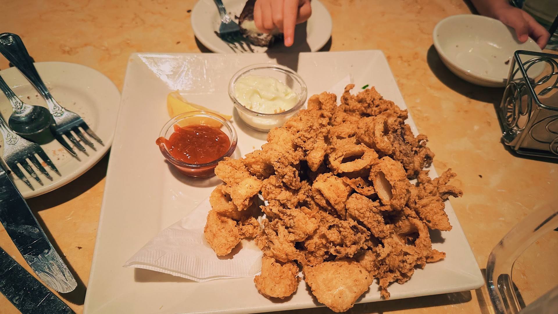 We ordered lots of food, orange chicken, calamari, buffalo busters, crab artichoke dip, chips with guac, etc. It took about 10 minutes for the appetizers to come then another 15 for the entrees. Plates arrived steaming hot from the bowels of hell, but alas the food was all good, but not great. All the dishes aside from Cheesecake factory exclusives fell under "it's good, but I've had better elsewhere." It seems the Cheesecake Factory has cornered itself into an odd place where it's a jack of all trades, master of none. Still the prices were fairly decent for pretty good food and great portions. The waitress kept stopping by to make sure the drinks were full, although she did forget my margarita until I asked for it again. Cheesecake was superb, but again...it's better elsewhere (I can name a place in New York that "takes the cake")