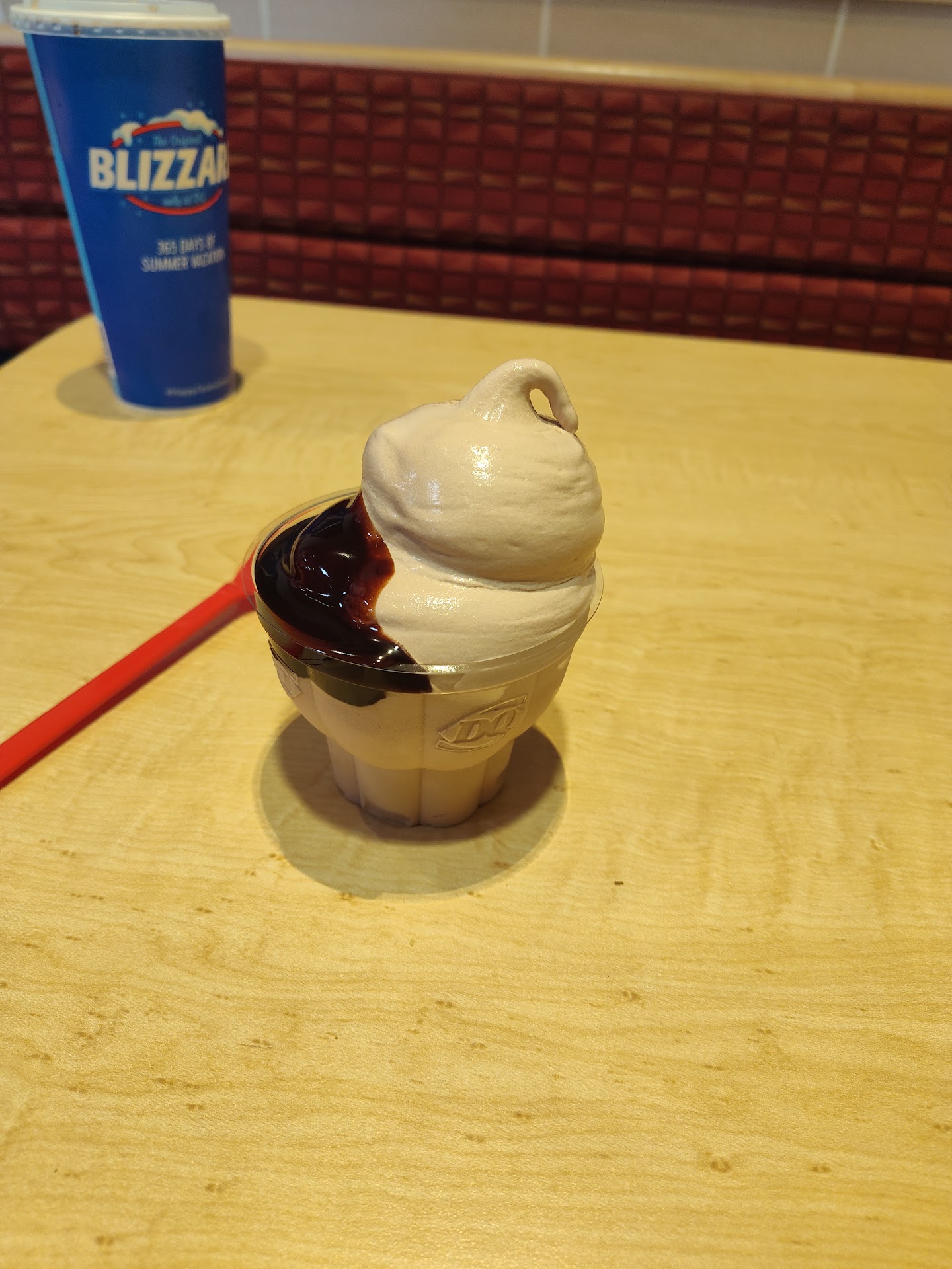 First, our lunches (burgers and cheese balls) were super sloppy. Mine was slapped together so poorly that most of the cheese was actually next to and under the sandwich, leaving almost half the bottom bun literally liquefied. Secondly, the extremely young lad who took our orders was apparently extremely inconvenienced by our desire to order lunch if his utterly lackadaisical attitude was any indication. Thirdly, THEY WERE OUT OF HALF THE ICE CREAM MENU!! No chocolate chip cookie dough, no brownie batter, no peanut butter cookie dough, no marshmallow, no Chips Ahoy, etc! They literally could not make most of the blizzards they had on their menu! Finally, when we eventually found stuff they did have, our moolatte and malt were not impressive. They were super runny and full of chunks of ice (the moolatte) and malt powder. Apparently they were also out of whipped cream as neither the moolatte or the malt had any. And we had to fetch them from the pass through window ledge thing since the lad couldnât be bothered (he saw and heard that they were done and just walked away to go clean random stuff). Overall, WORST DQ VISIT EVER! Iâd give them zero...