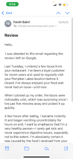 After leaving my initial google review about clearly getting food poisoning from this place, the restaurant responded publicly asking me to email them to “look into this further” I did exactly that immediately —emailed them a week ago, (see attached screenshots).